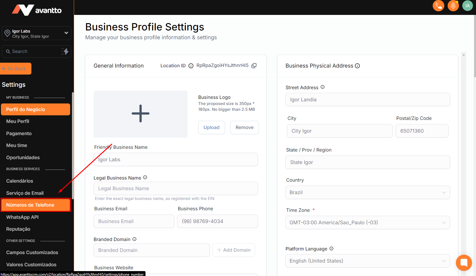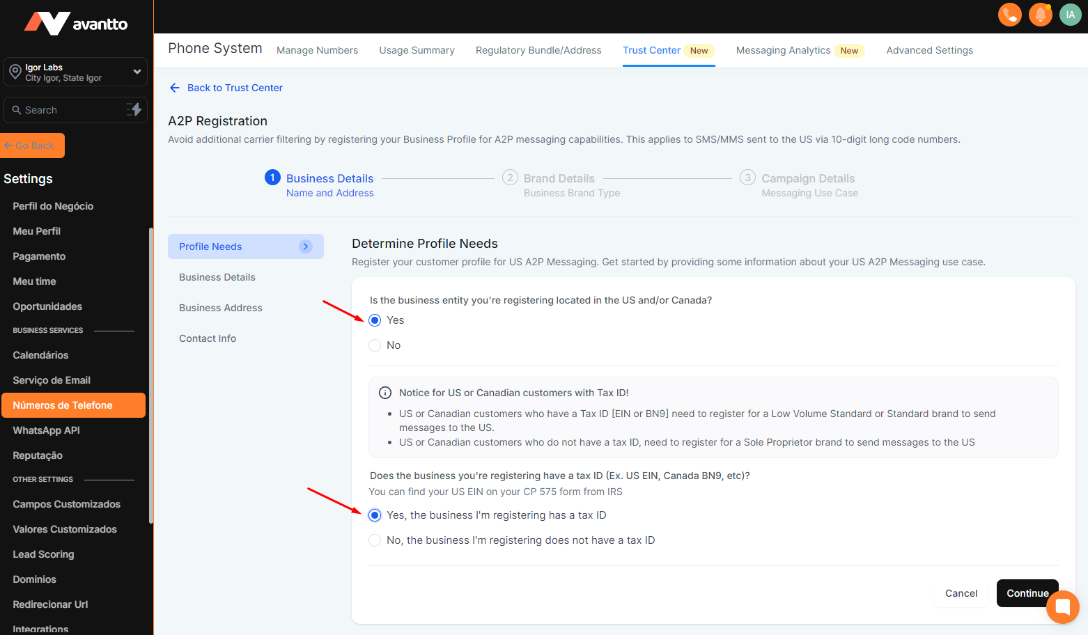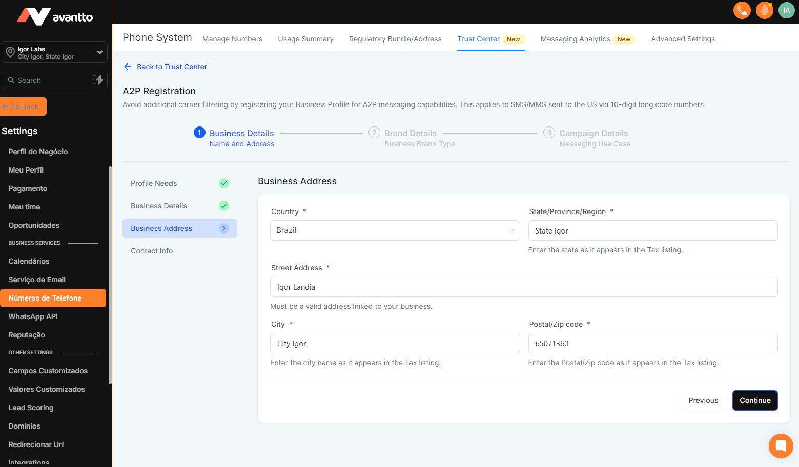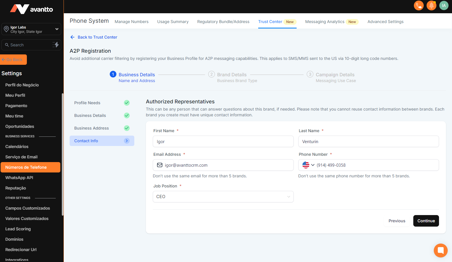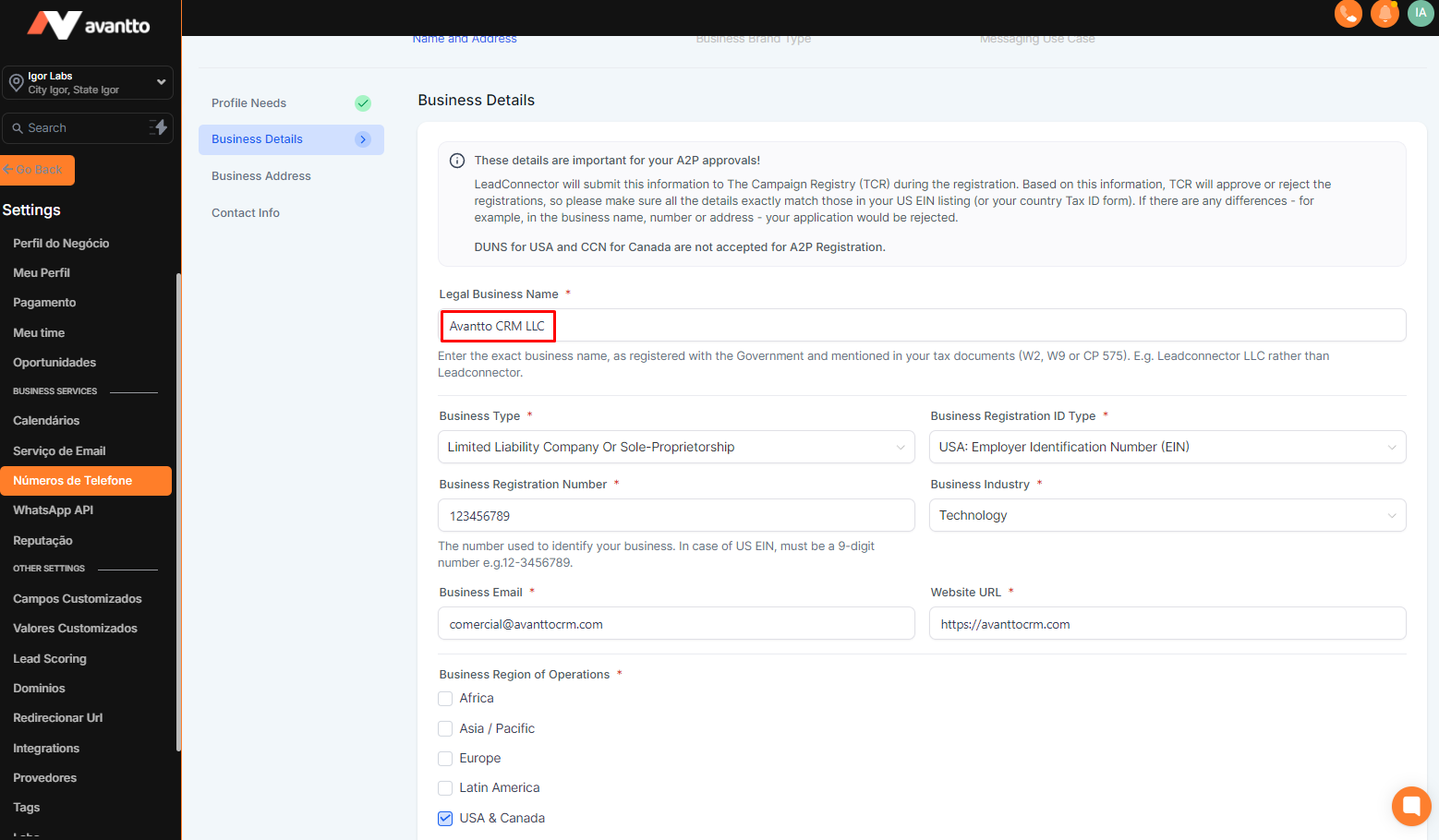 Before starting to fill out the A2P form, it is necessary to complete some steps: fill in the Custom Values with the company's data, integrate the client's domain or subdomain in Avantto, and publish the standard landing pages for A2P verification.
