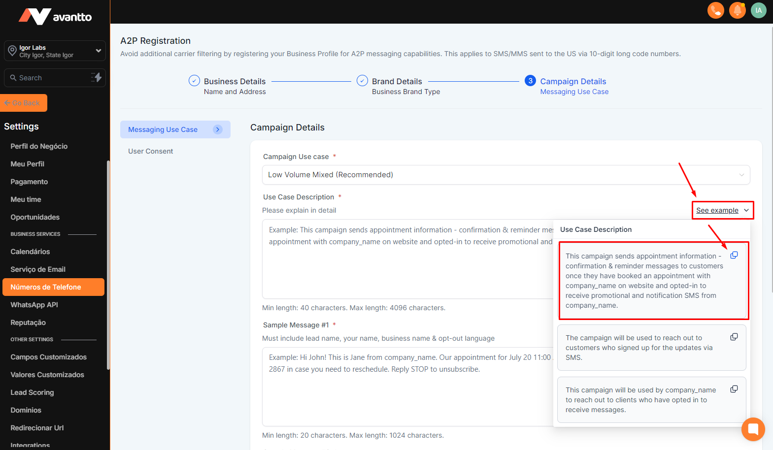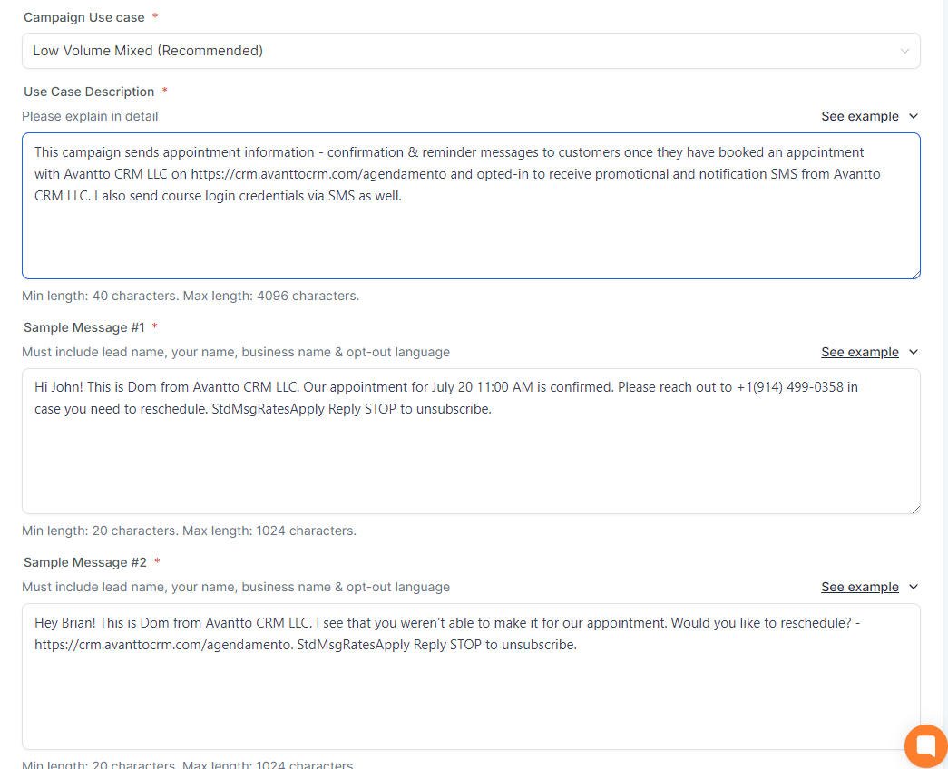 3.11 Now you will fill in the campaign details and examples of campaign usage. In all fields, click "See example", copy the presented text and replace it with the values corresponding to the client's company, for example where it says company_name put Avantto CRM LLC and where it says phone number put the company's number, as well as in the example texts below the image below. A crucial point is to replace the fields related to the “website” with the link to the “FORMS FOR A2P” page that we configured earlier and add “StdMsgRatesApply” at the end of the corresponding text.