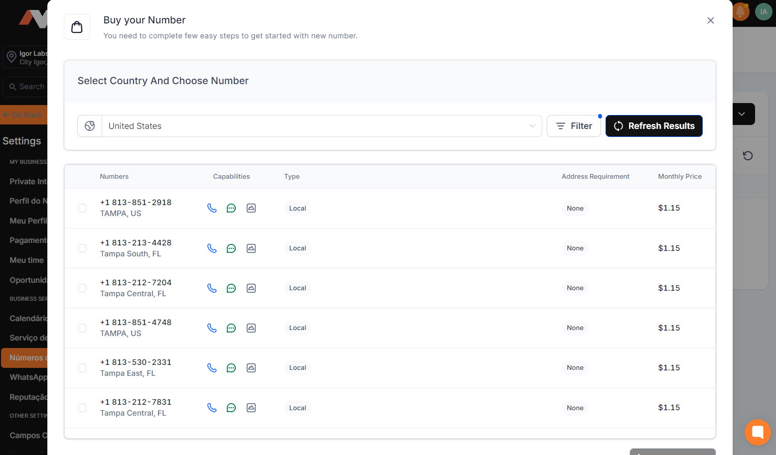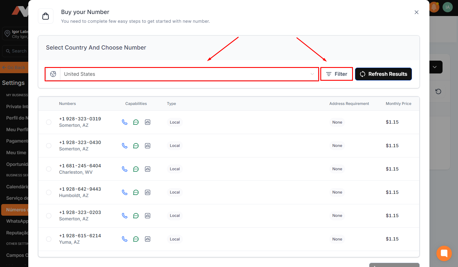 2.4 With the screen for choosing the number open, select the desired country for purchase — in this case, the United States. Then, click on "Filter" to choose the area code of the number you wish to acquire.