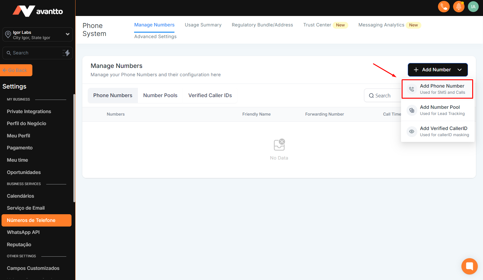 Number Purchase: Detailed instructions on how to acquire a number on Avantto, including selecting the country, area code, and type of number.