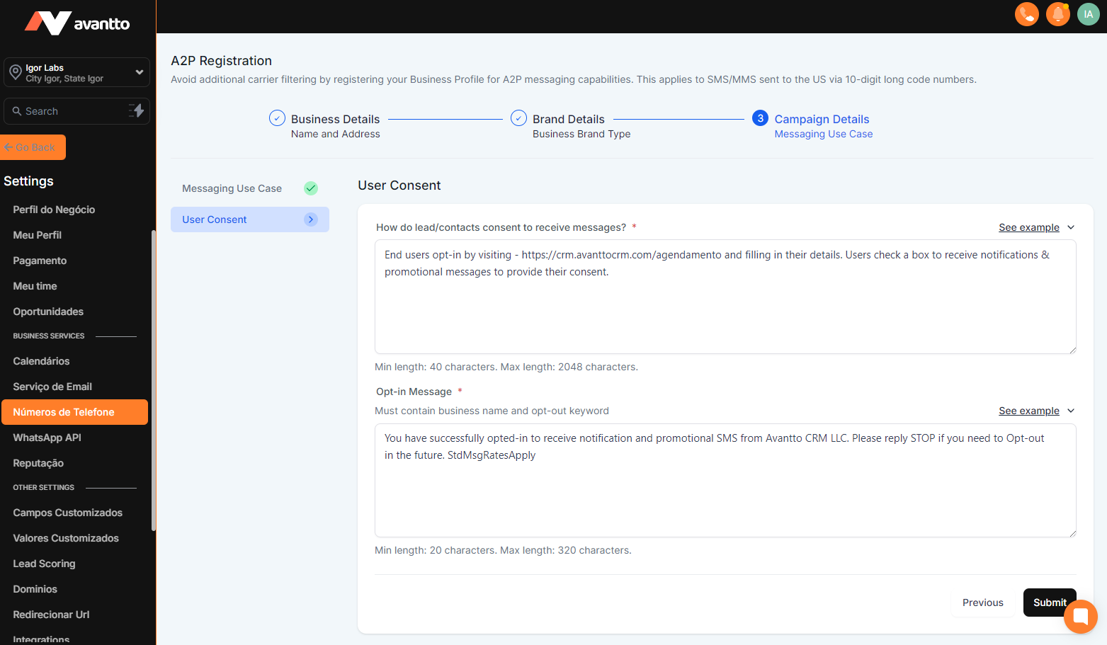 3.12 After filling in all the fields as per the examples above, click “Submit” and wait for the A2P status to change to “Approved”, as demonstrated earlier. The process takes on average between 3 to 7 days to be approved; it first goes through the “Brand” verification before the “Campaign”, being updated as each stage is approved.