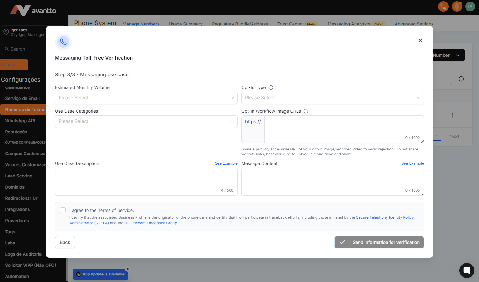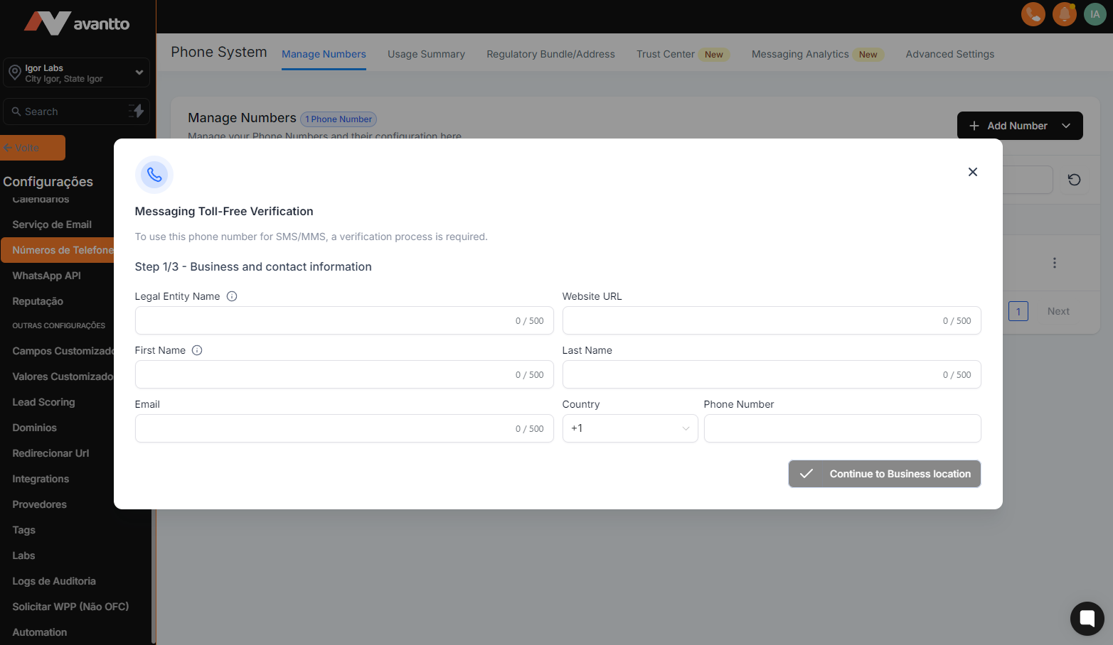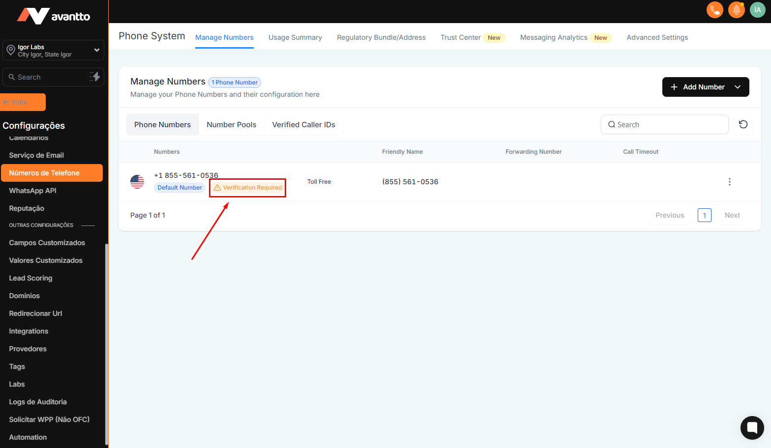 1.1 After purchasing the "Toll Free" number as shown in Step 2, go to the Manage Numbers page (visible only to administrators and agency users). Remember that you will face verification delays if you omit any information.