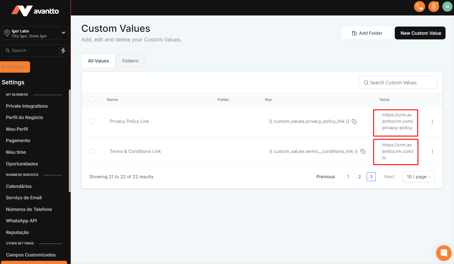 3.4 After publishing the mentioned pages, update the Custom Values of the "Privacy Policy Link" and "Terms & Conditions Link" with the respective links of the published pages.