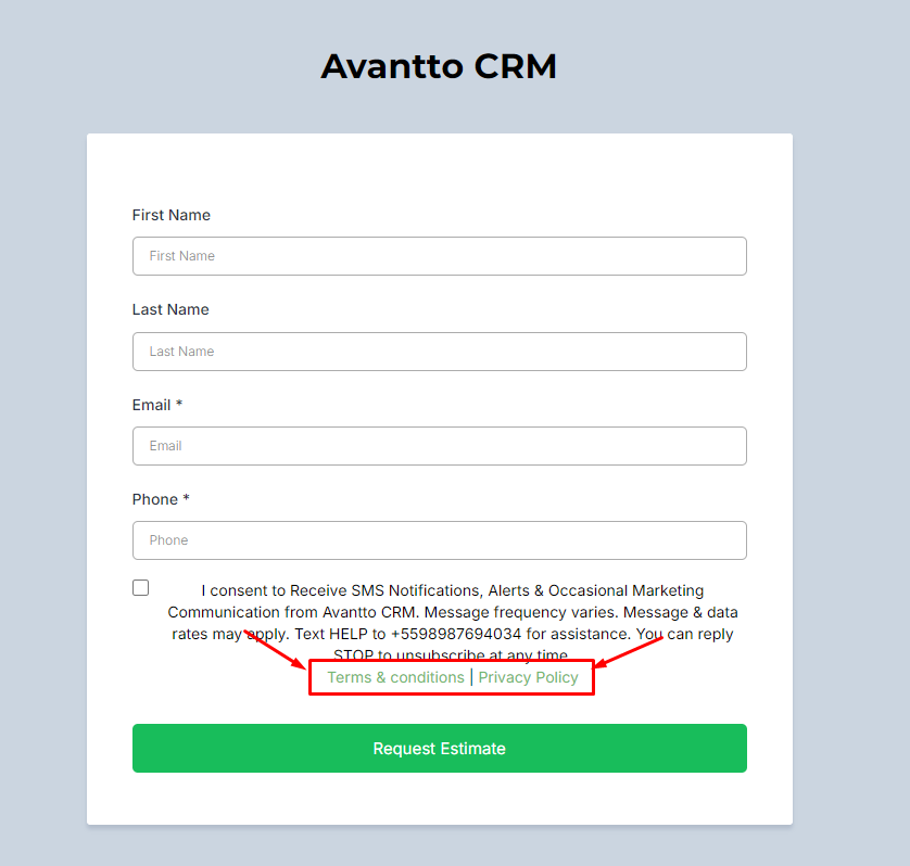 "End users opt-in by visiting - https://crm.avanttocrm.com/agendamento and filling in their details. Users check a box to receive notifications & promotional messages to provide their consent."