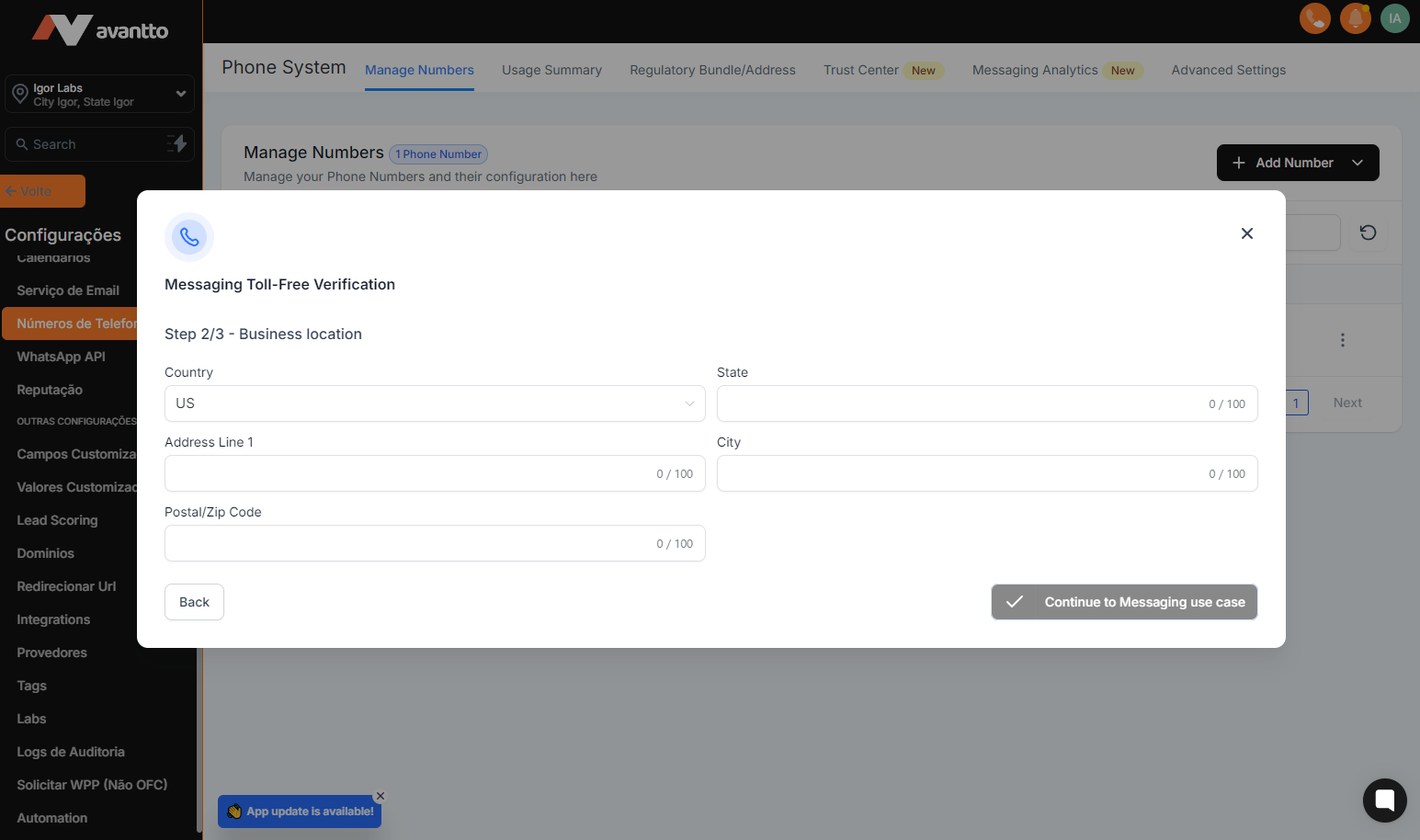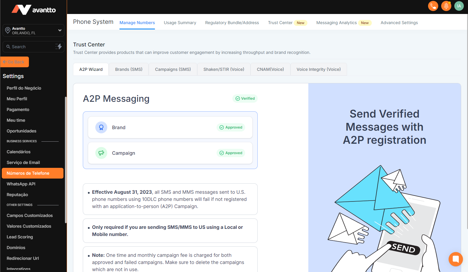 This guide addresses the verification process for using A2P (Application-to-Person) messaging in the United States and purchasing numbers with specific Area Codes within the Avantto platform. The main points include: