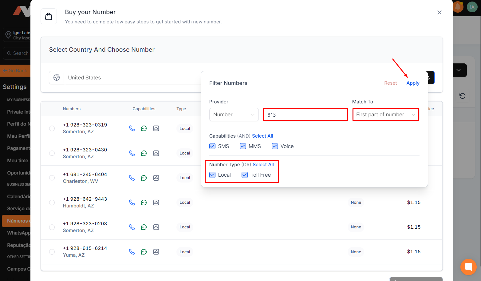 2.5 To find the number with the desired area code, in "Match To", select "First part of number" and enter the code in the box on the left (for example, 813 for Tampa FL). In choosing the type of number, select according to your verification method; if it's A2P, check only "Local"; if it's Toll Free, select that option. After the settings, click "Apply".