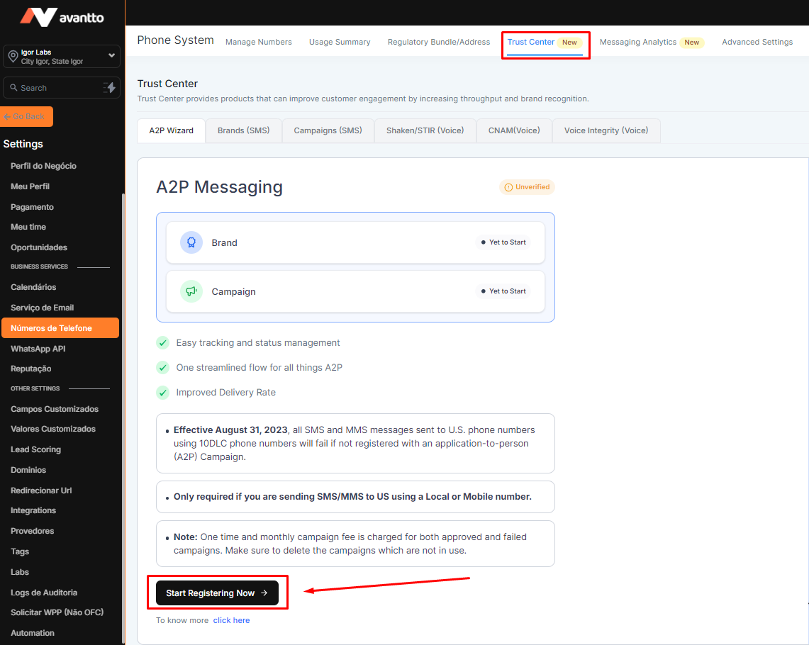 3.6 Once the above configurations are done, go to "Settings > Phone Numbers > Trust Center > Start Registering Now" to fill out the A2P verification form.