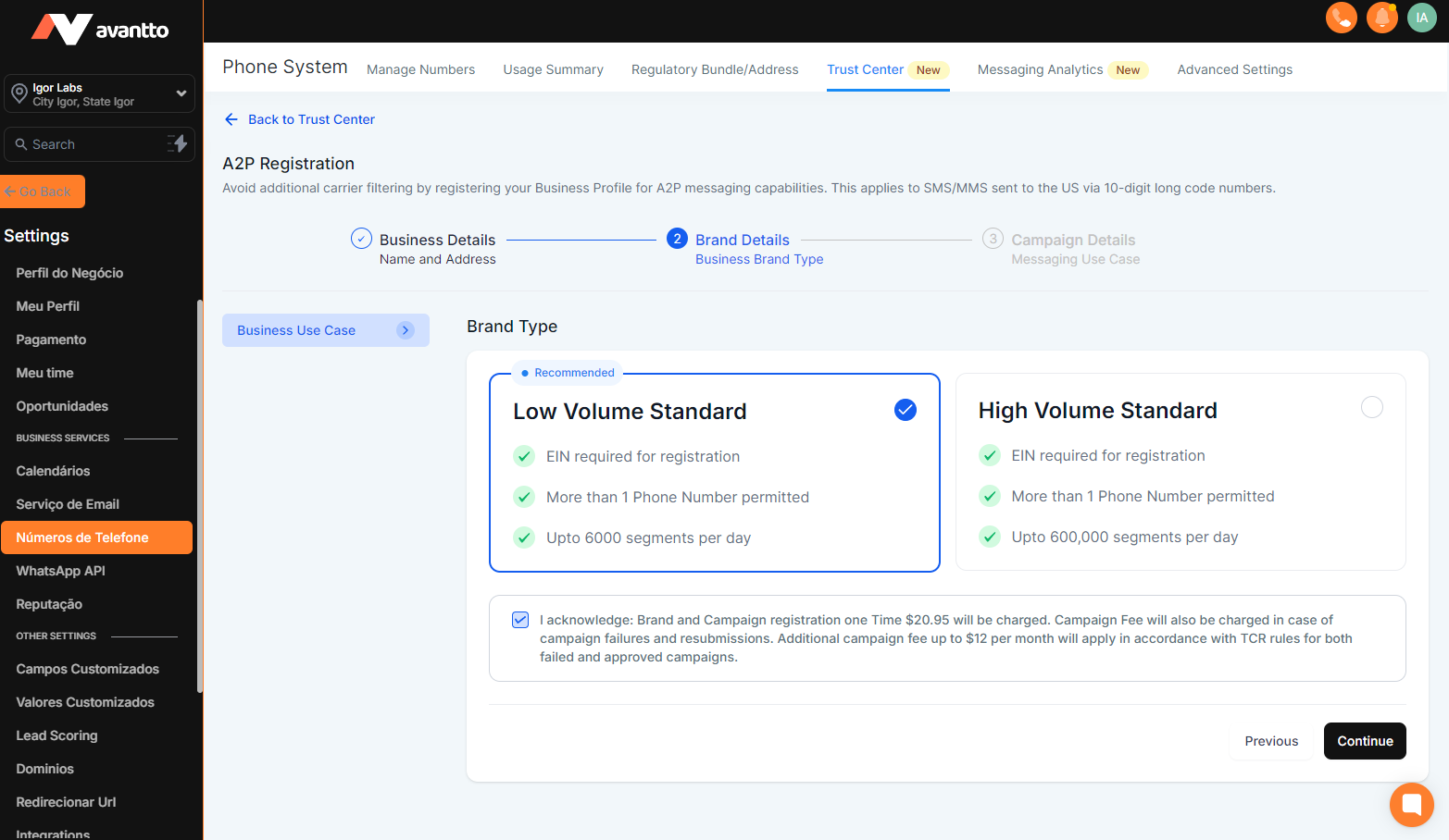 3.11 In the next step, select the "Brand Type" form according to the size of your company; the first option generally allows up to 600,000 SMS per day. It is worth noting that there is a one-time variable fee currently set at $20.95 for A2P verification. Select the "Brand Type", check the box acknowledging the terms, and click continue.