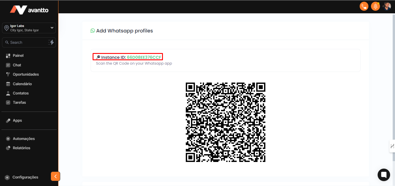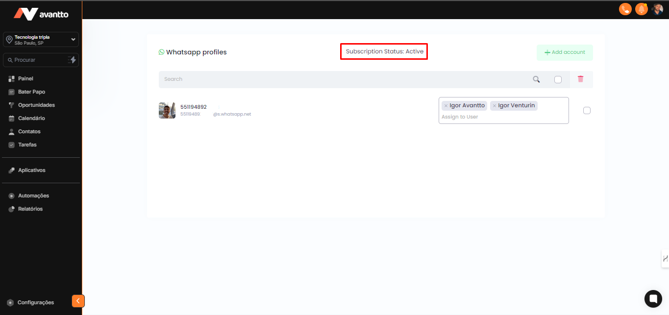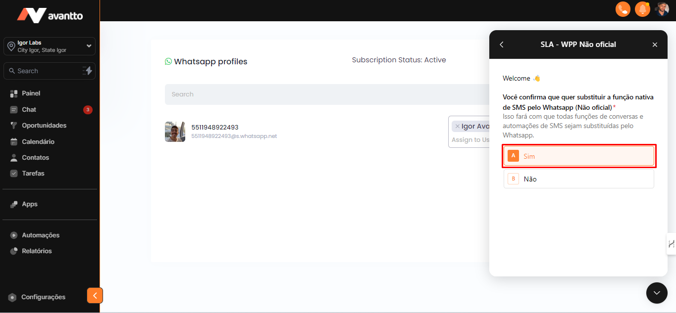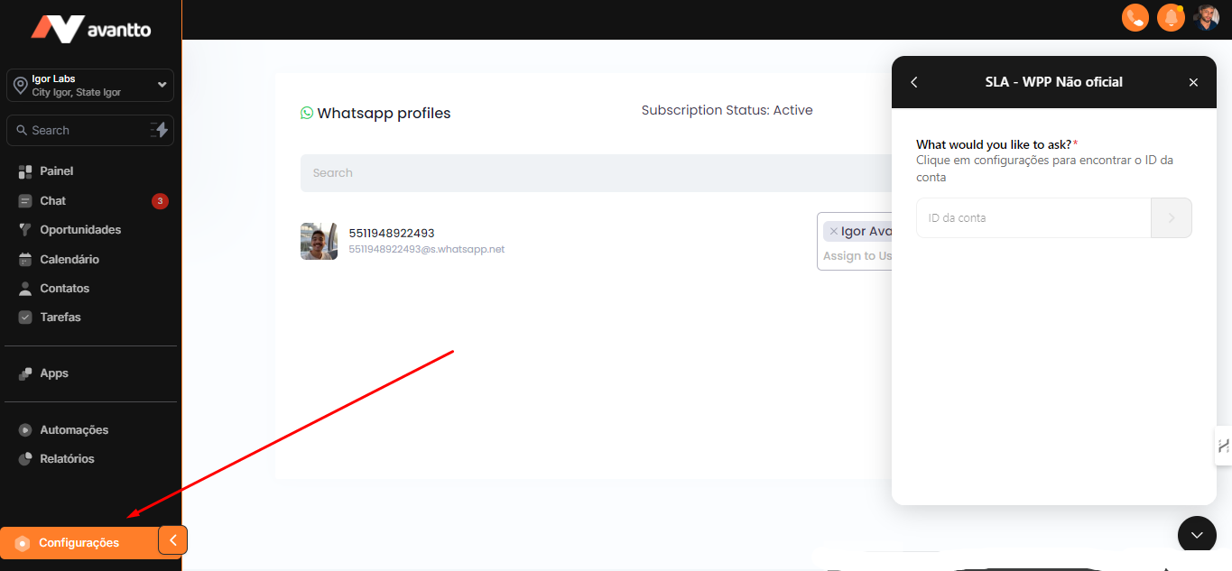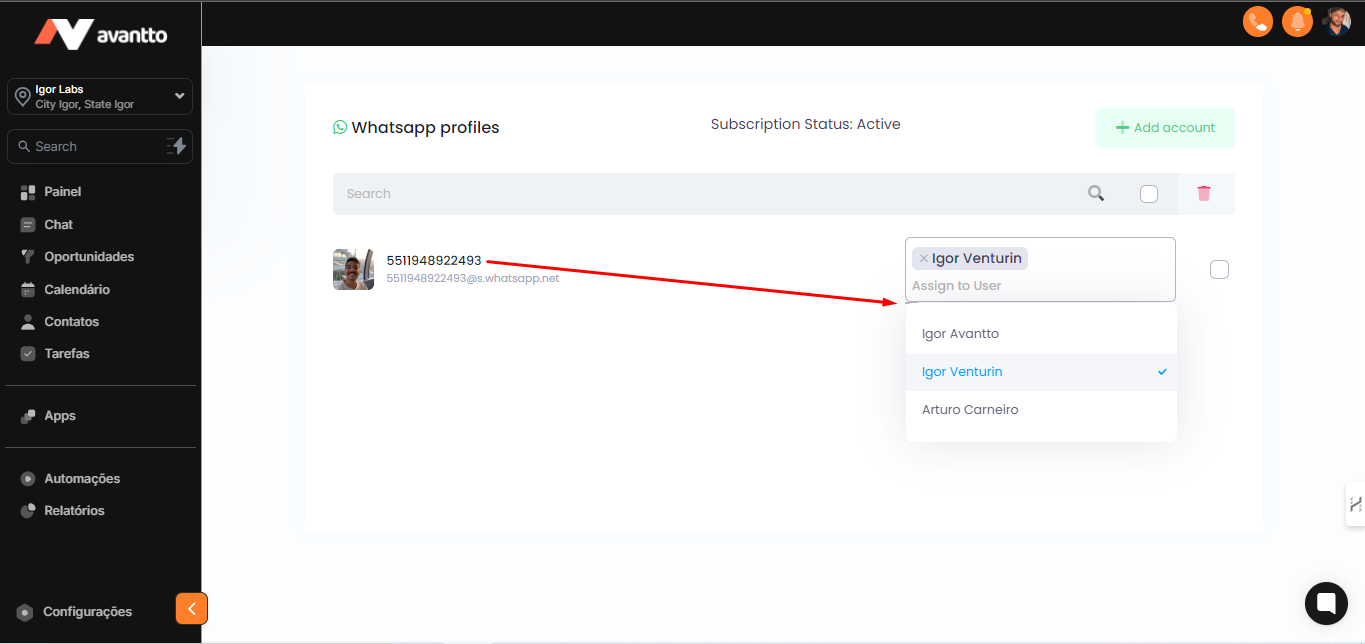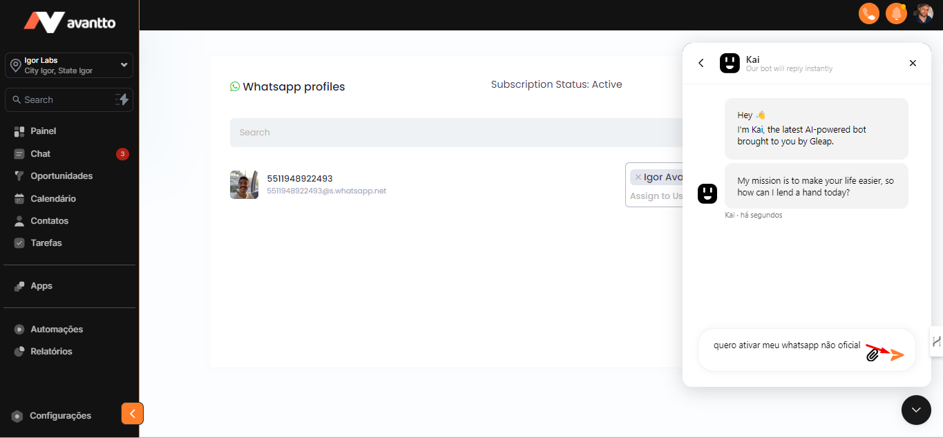 Additionally, the person sending the message through your user in Avantto also needs to be linked to a registered number on unofficial WhatsApp. If this doesn't happen, the message will not be sent. So, whenever there’s an error in sending, check if the opportunity is assigned to someone and if the user is linked to an active number within Avantto, as shown in step 3.3.