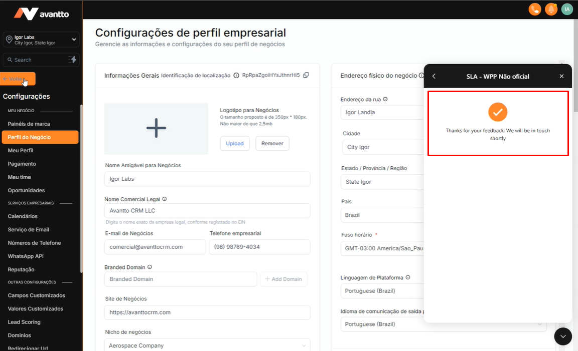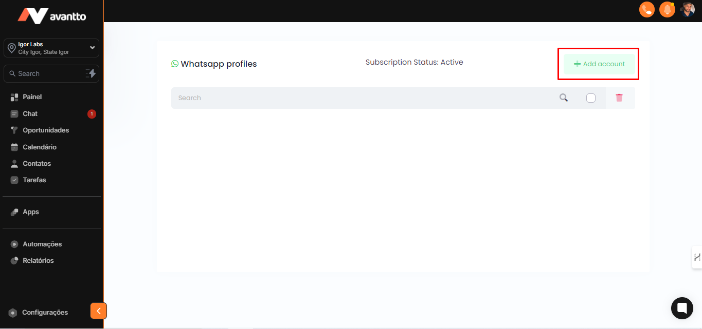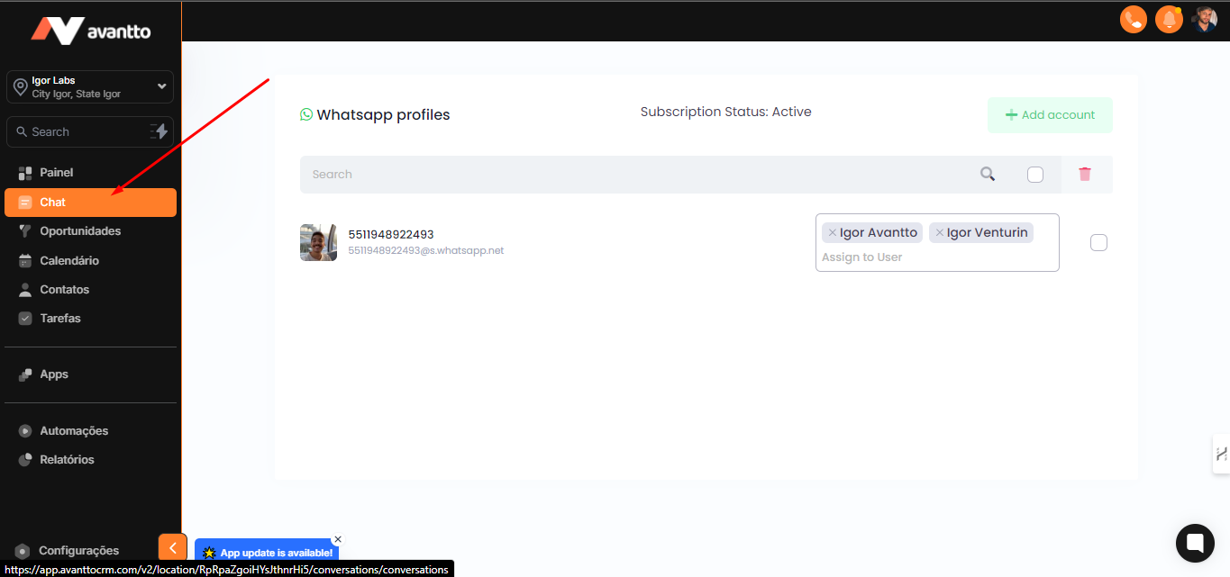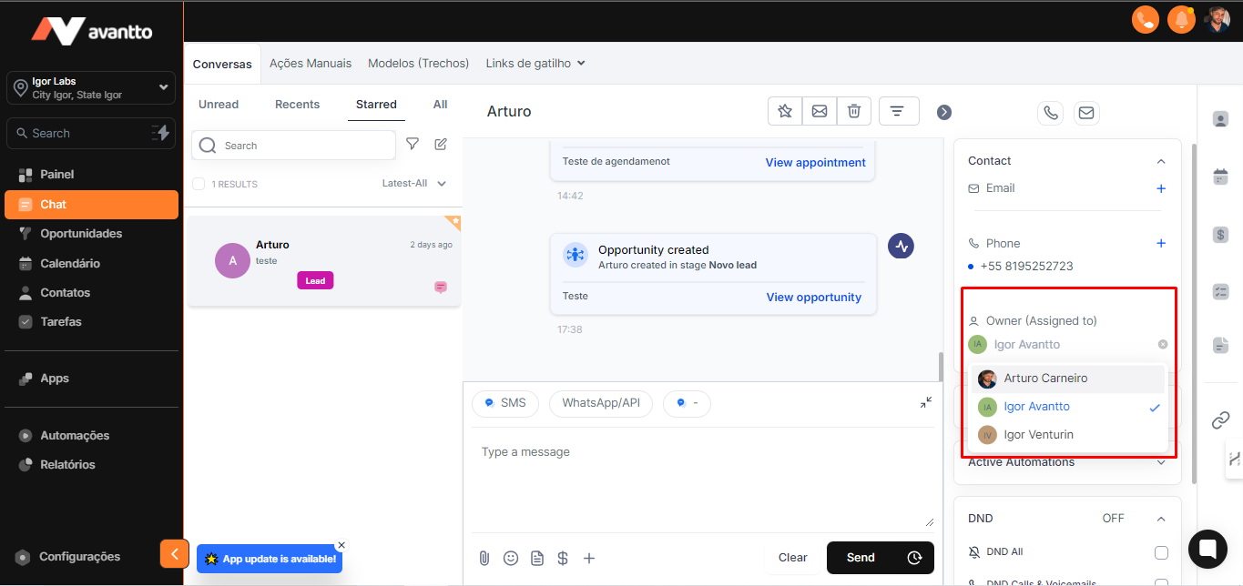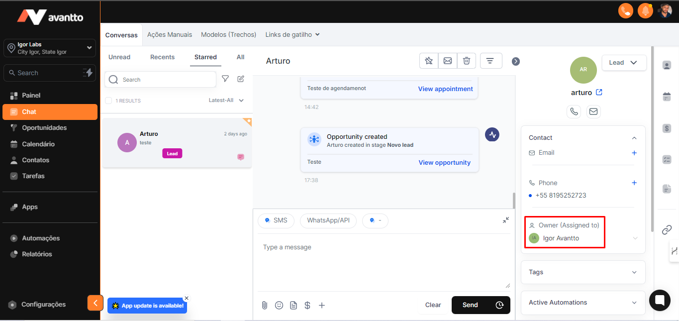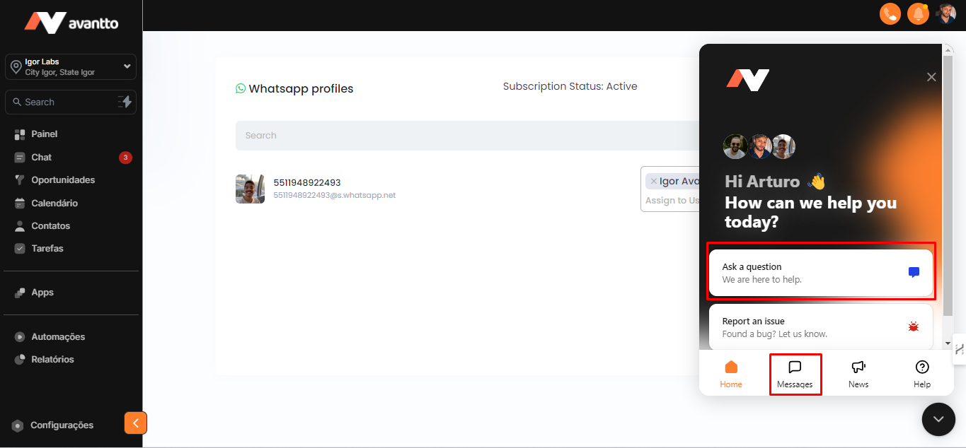 Additionally, the person sending the message through your user in Avantto also needs to be linked to a registered number on unofficial WhatsApp. If this doesn't happen, the message will not be sent. So, whenever there’s an error in sending, check if the opportunity is assigned to someone and if the user is linked to an active number within Avantto, as shown in step 3.3.