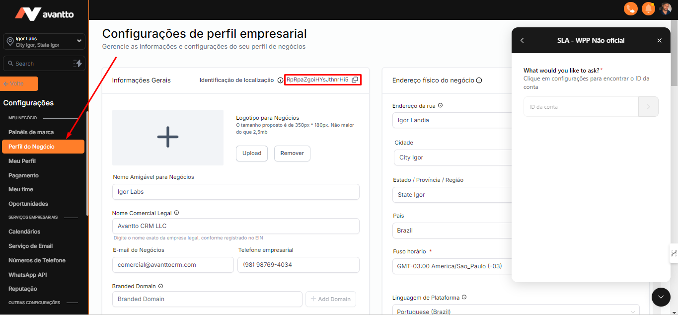 Still in the side menu, select "Business Profile" and copy the Location ID code.