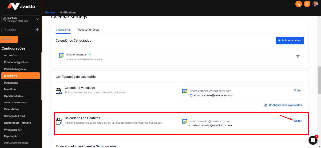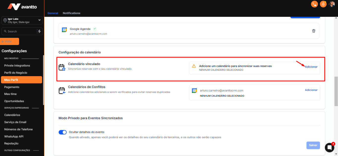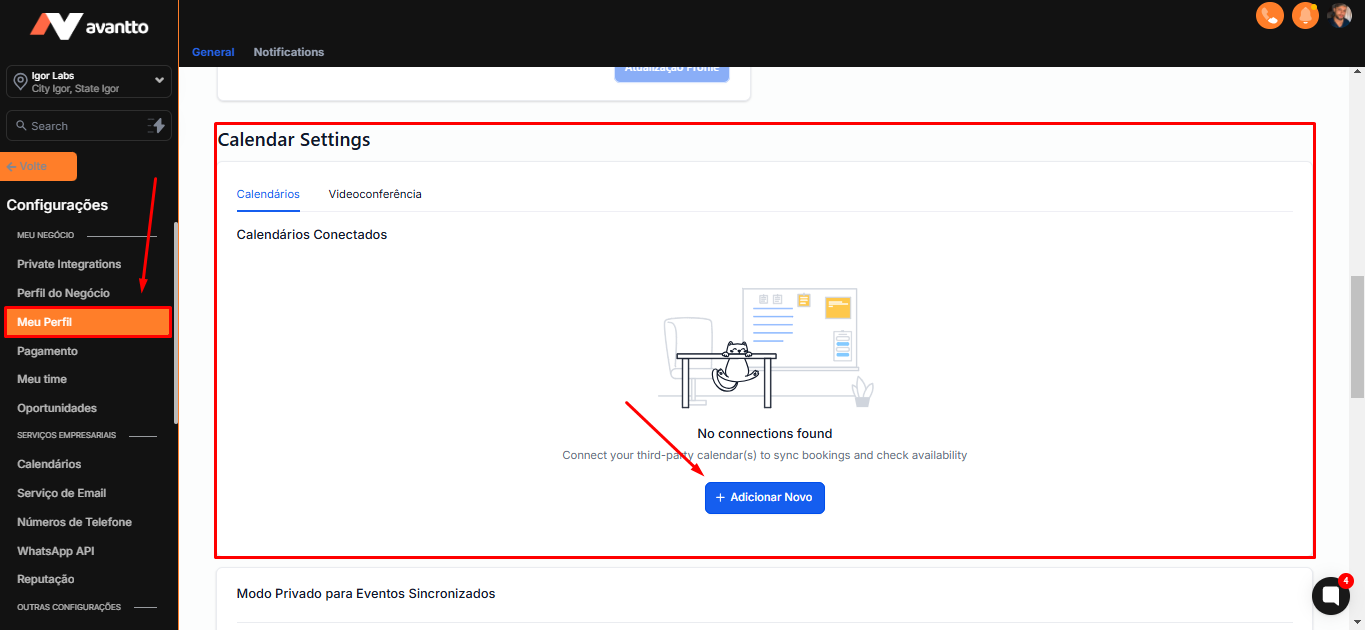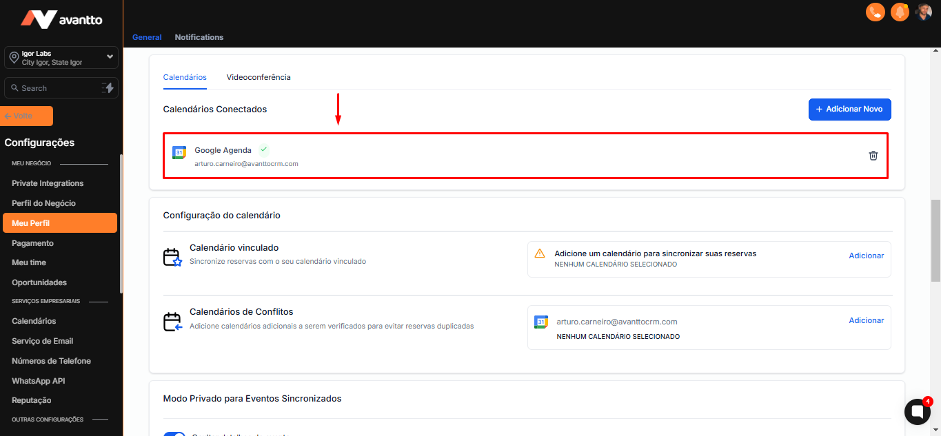 1.6 After connecting, go back to your profile and check if your calendar is connected, as shown in the image. If not, click again on Add New to sync Google Calendar (performing steps 1.2 to step once again).
