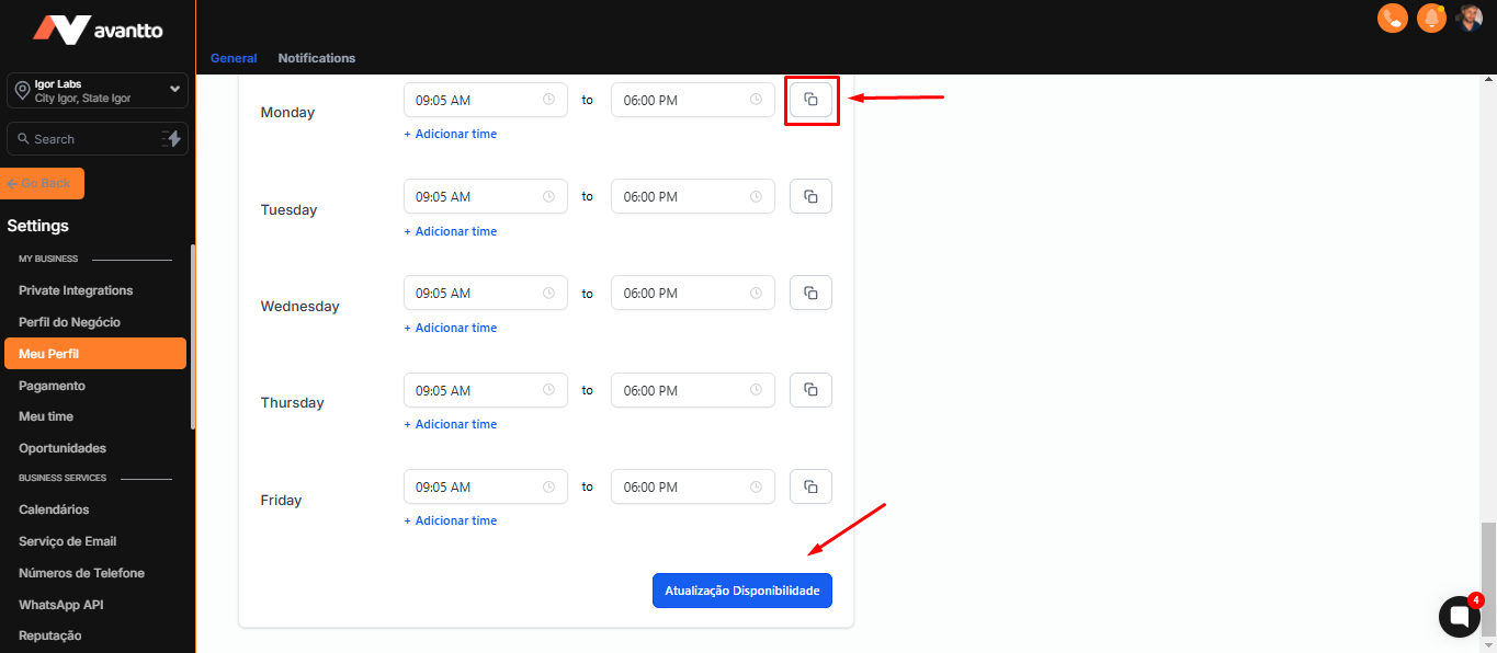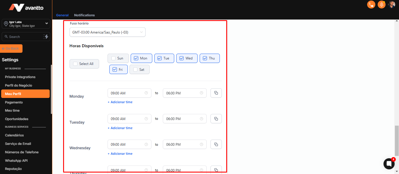 2.4 After setting the location, choose the time zone (for example, São Paulo) and set the available times (for example, from 9:00 AM to 6:00 PM).