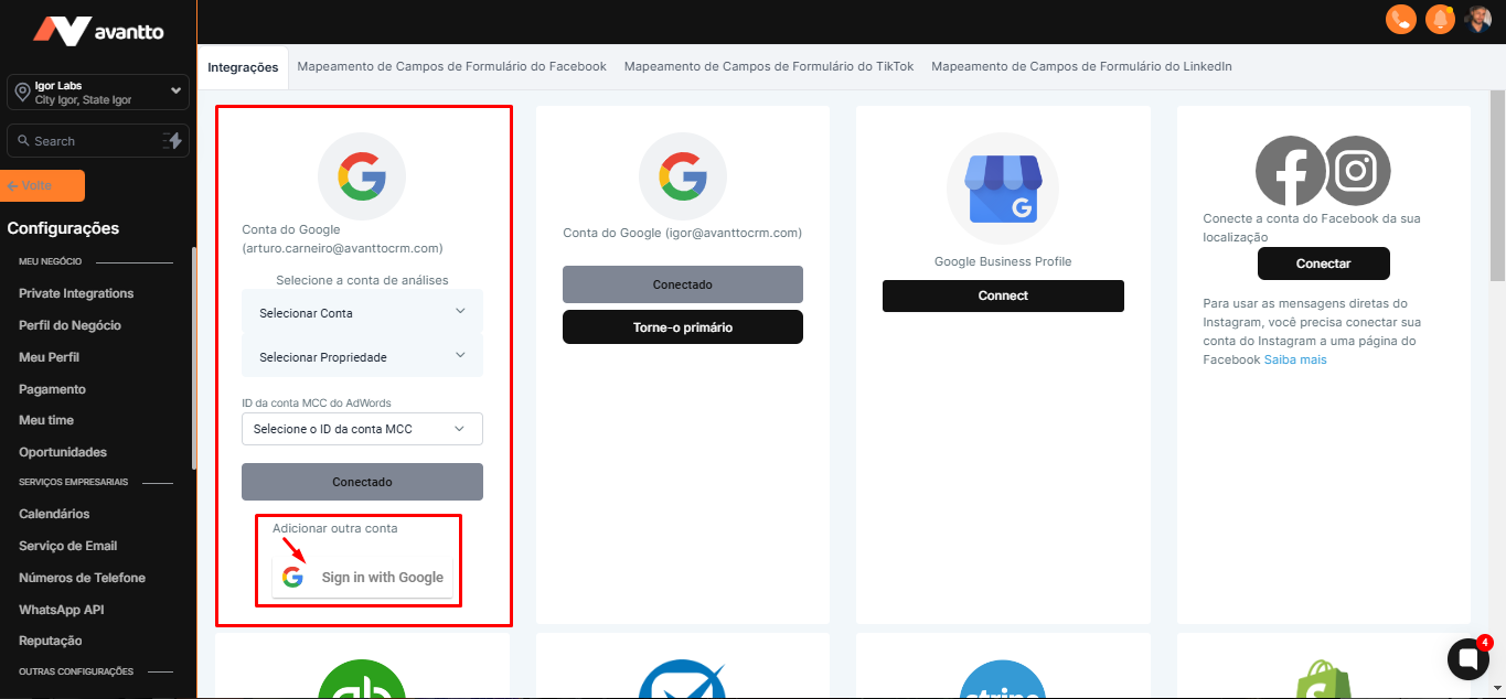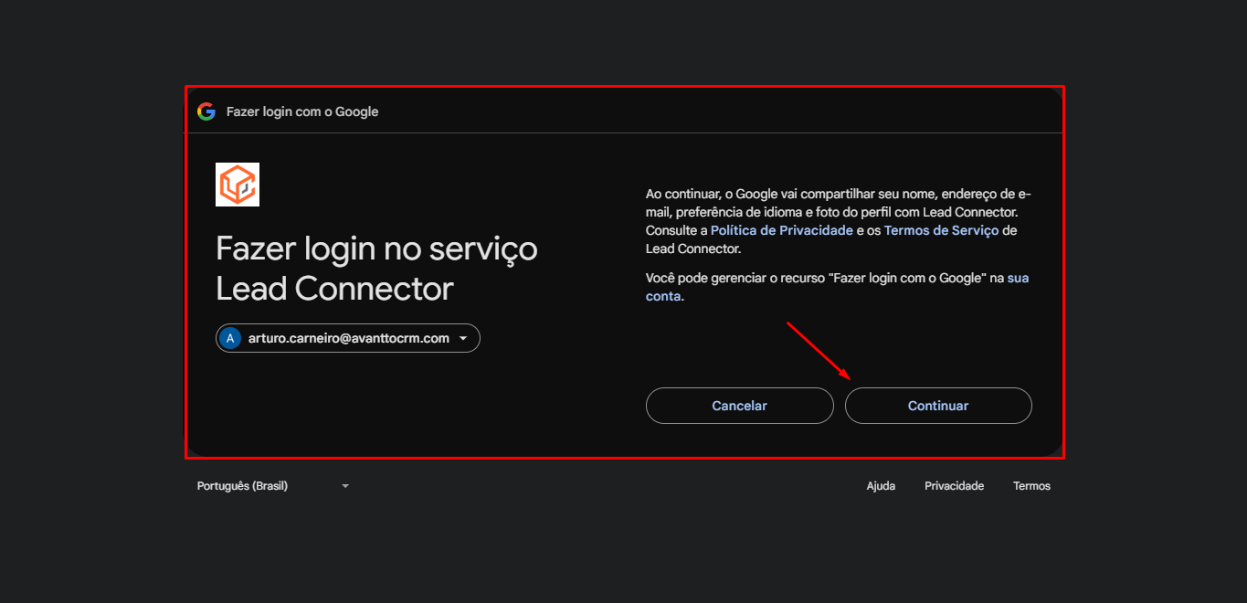 1.5 Select the Google account you want to connect (for example, Igor Venturin) and click on Continue. Then, allow the requested permissions to complete the connection.