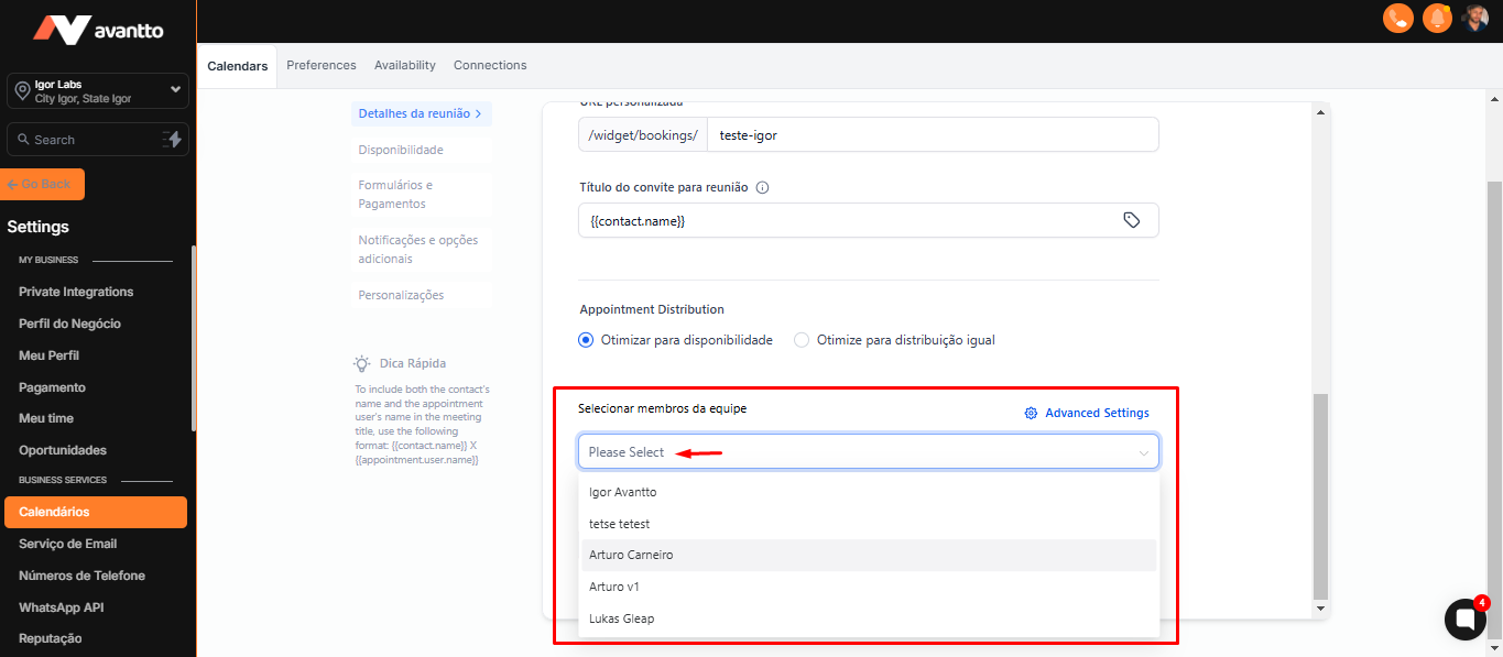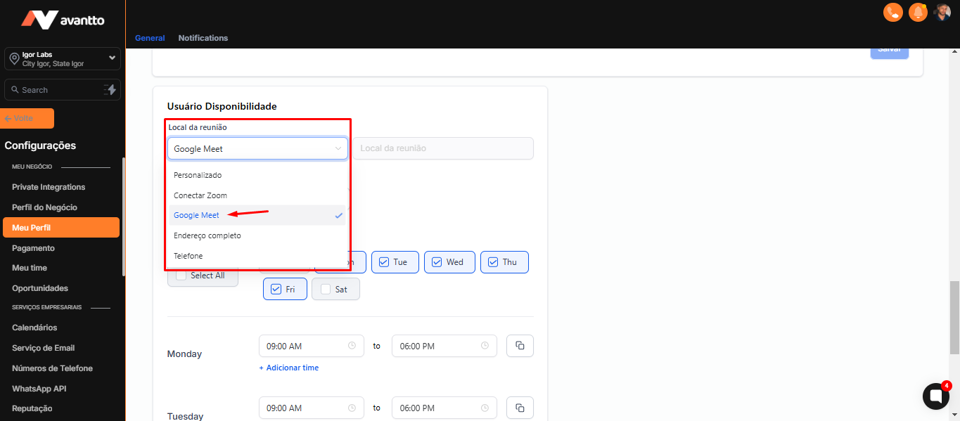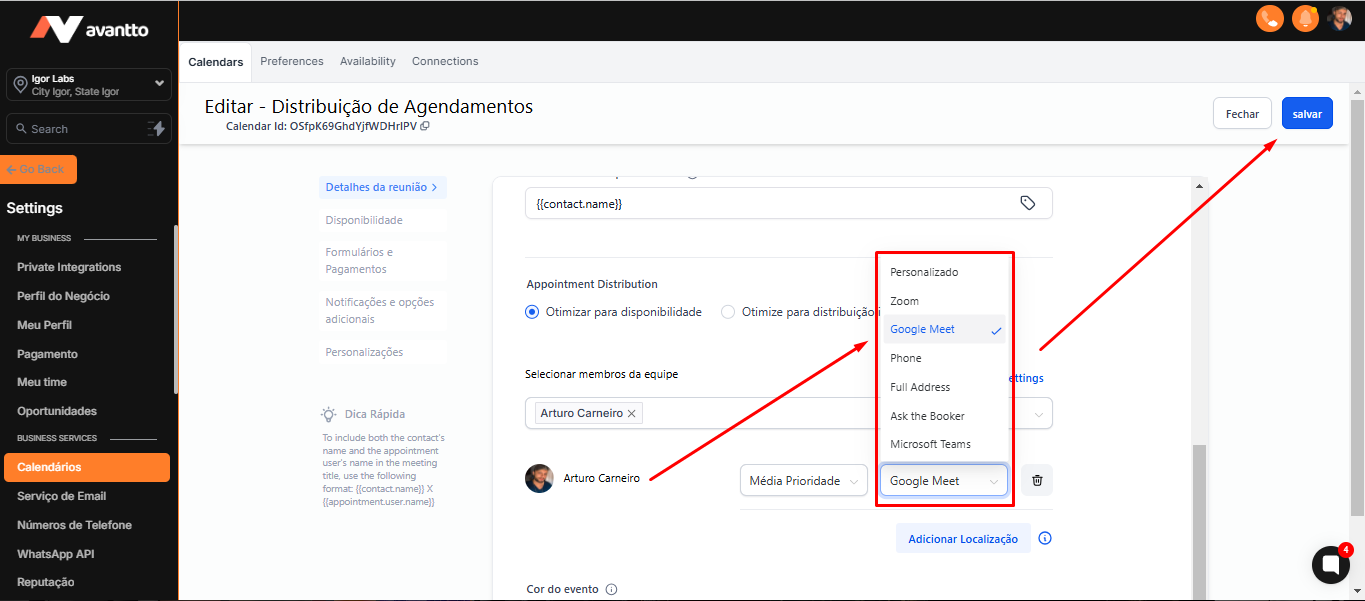 It is essential to set up the meeting location, as this ensures that the link will be generated automatically, both when creating an opportunity within calendars and through automations. For example, at Avantto, we have an automation that sends the online meeting link 10 minutes before the start. If this setting is not applied, that is, if Google Meet is not selected as the meeting location, the link will not be generated. Consequently, the automation will send a message with an empty link, which can cause confusion and delays in attending the meeting. Therefore, always check this setting to ensure a smooth and efficient experience.