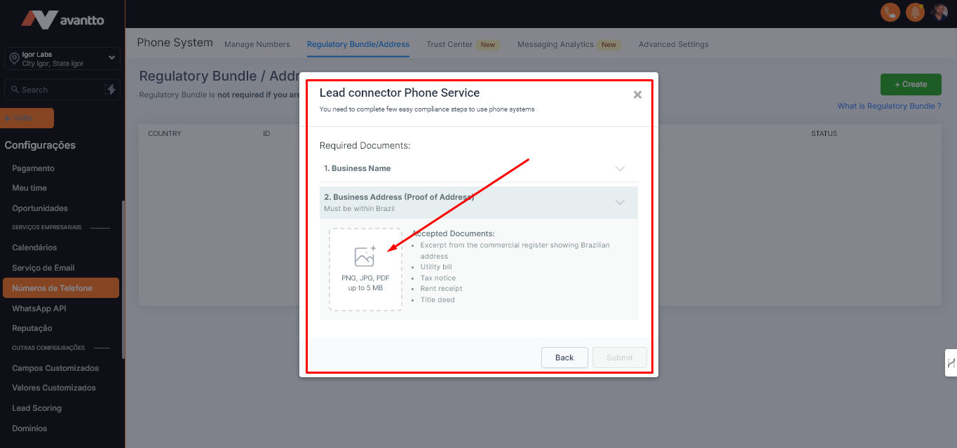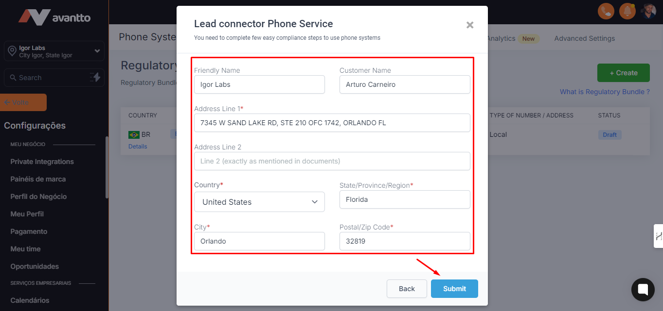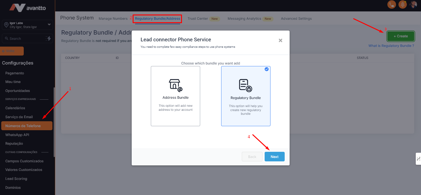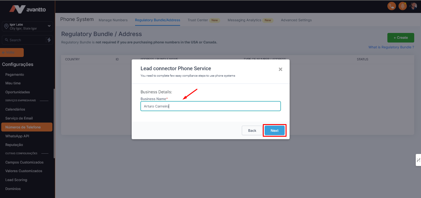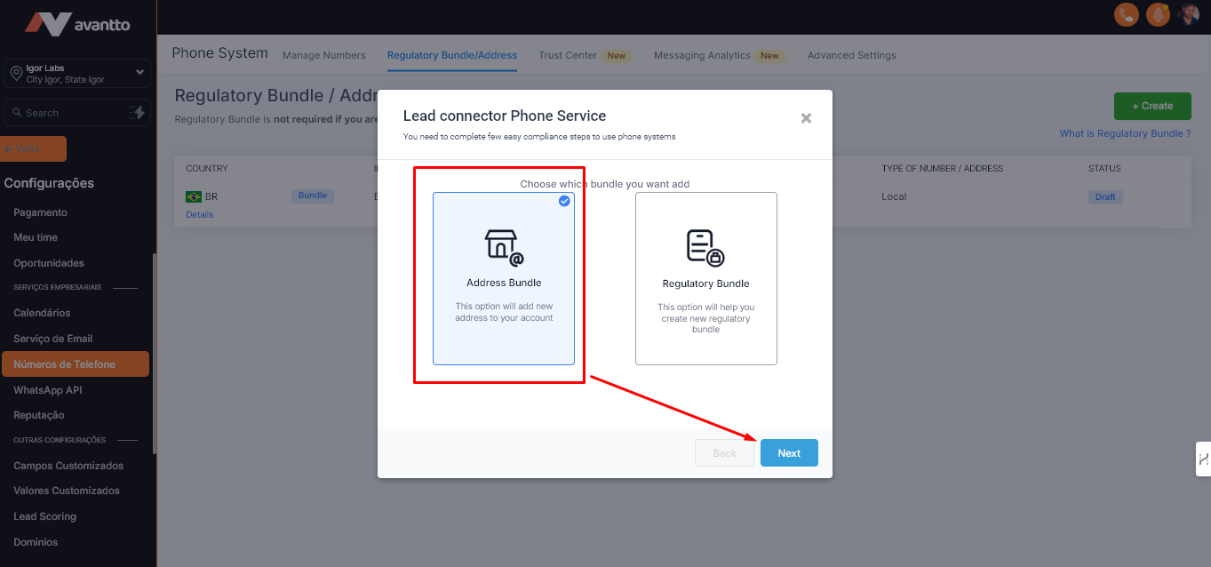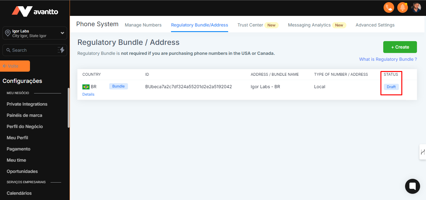 1.1 To use local numbers at Avantto in Brazil, it is necessary to configure the "Bundle" and the "Address".