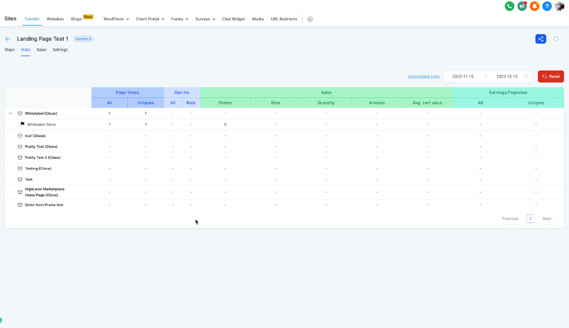 Stats will give you insights into the number of page views and opt-ins you have had on your site. In addition, you can see the number of sales and even earnings. Learn more about stats and what they count here: Understanding Stats.
