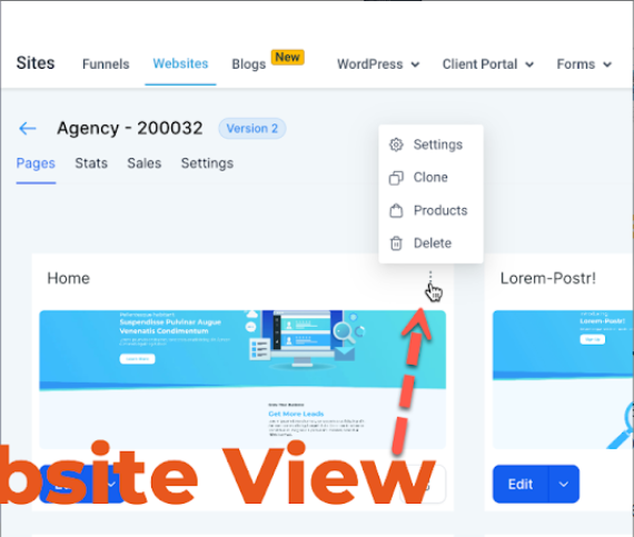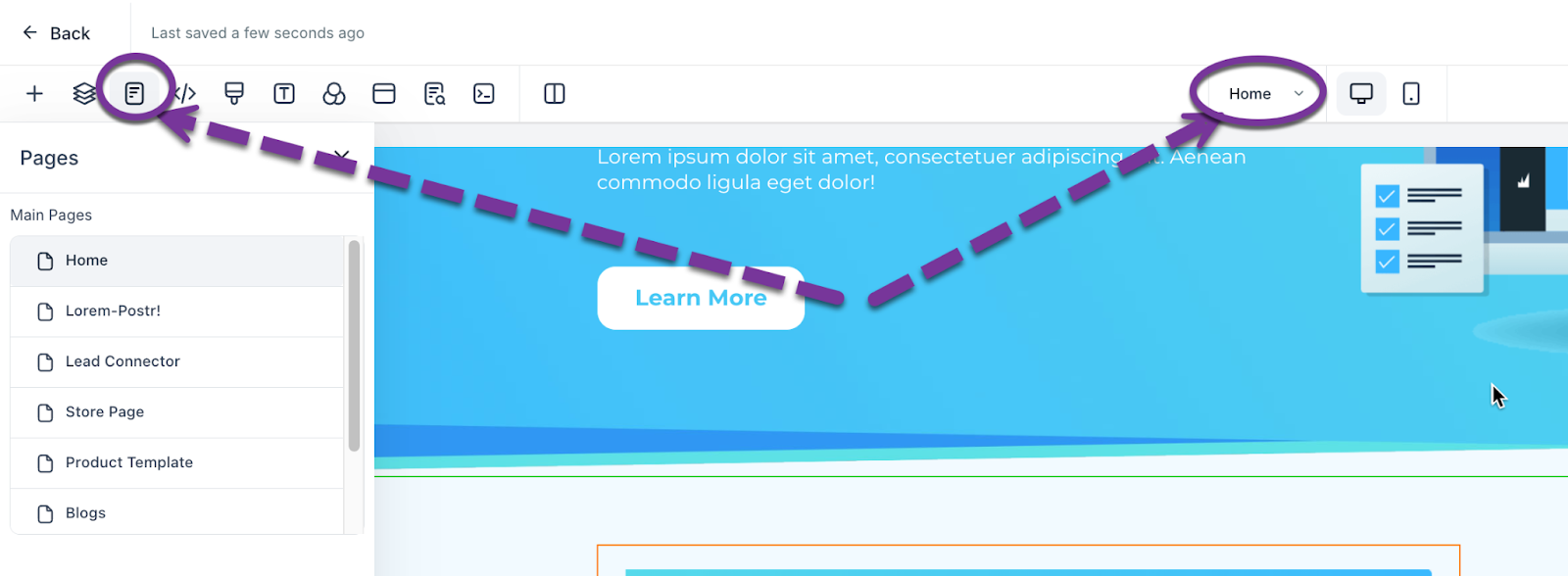 View and navigate to other web pages within your Funnel or Website from the pages tab. Giving you the ability to quickly move between web pages when editing multiple web pages. You can access this tab from both the right and middle site builder navigation bar.