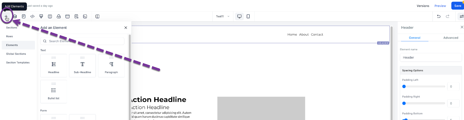 Every element on a webpage requires a section. Within this section, you need to have at least one row. This row needs to have at least one column. Adding all three of these (Section > Column > Row) we are then able to add an element from the "+Add Element" bar.