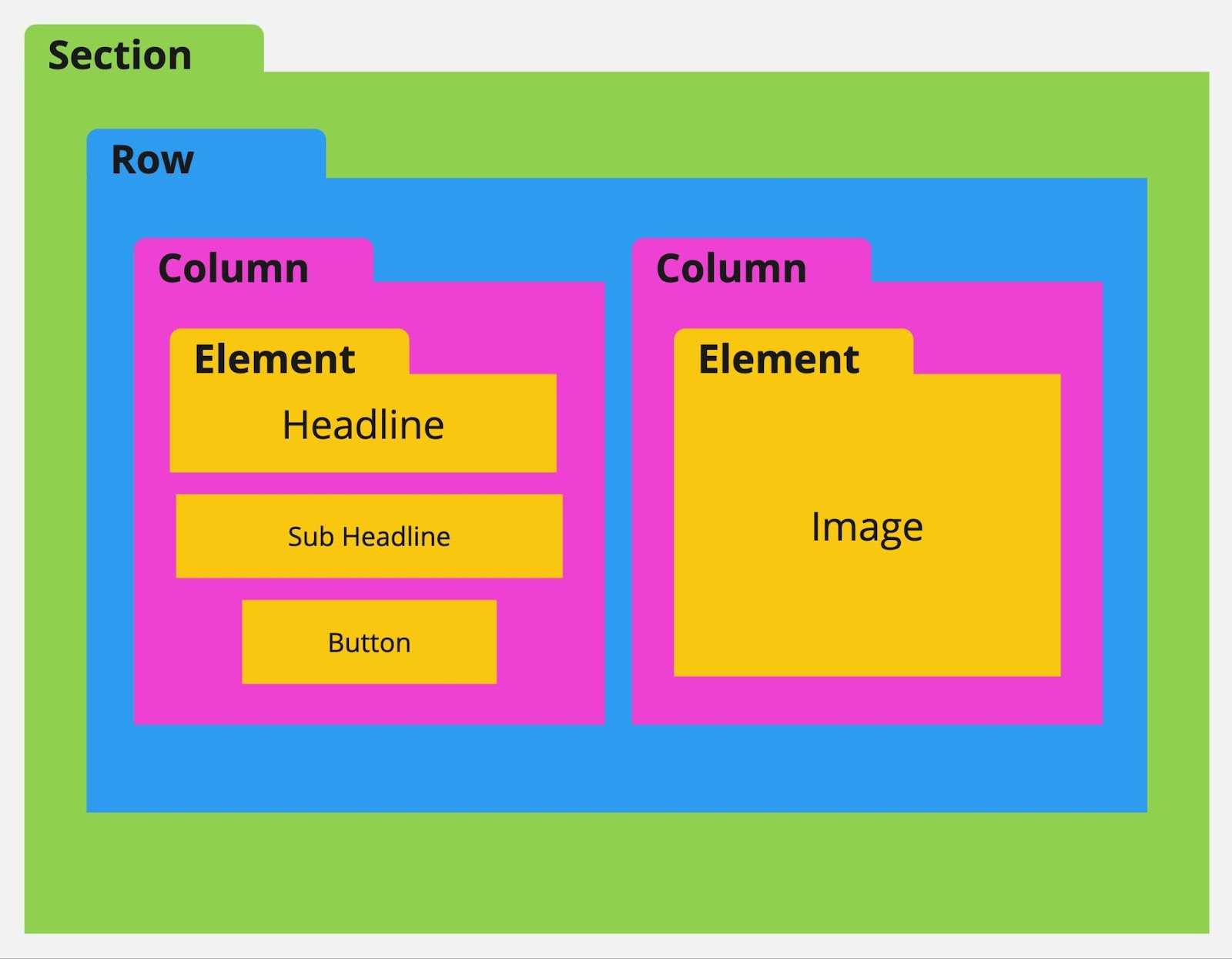 Sections (Green) > Rows (Blue) > Columns (Pink) > Elements (Orange)