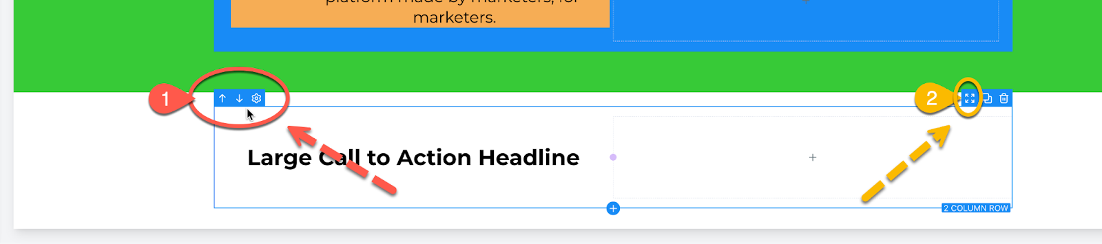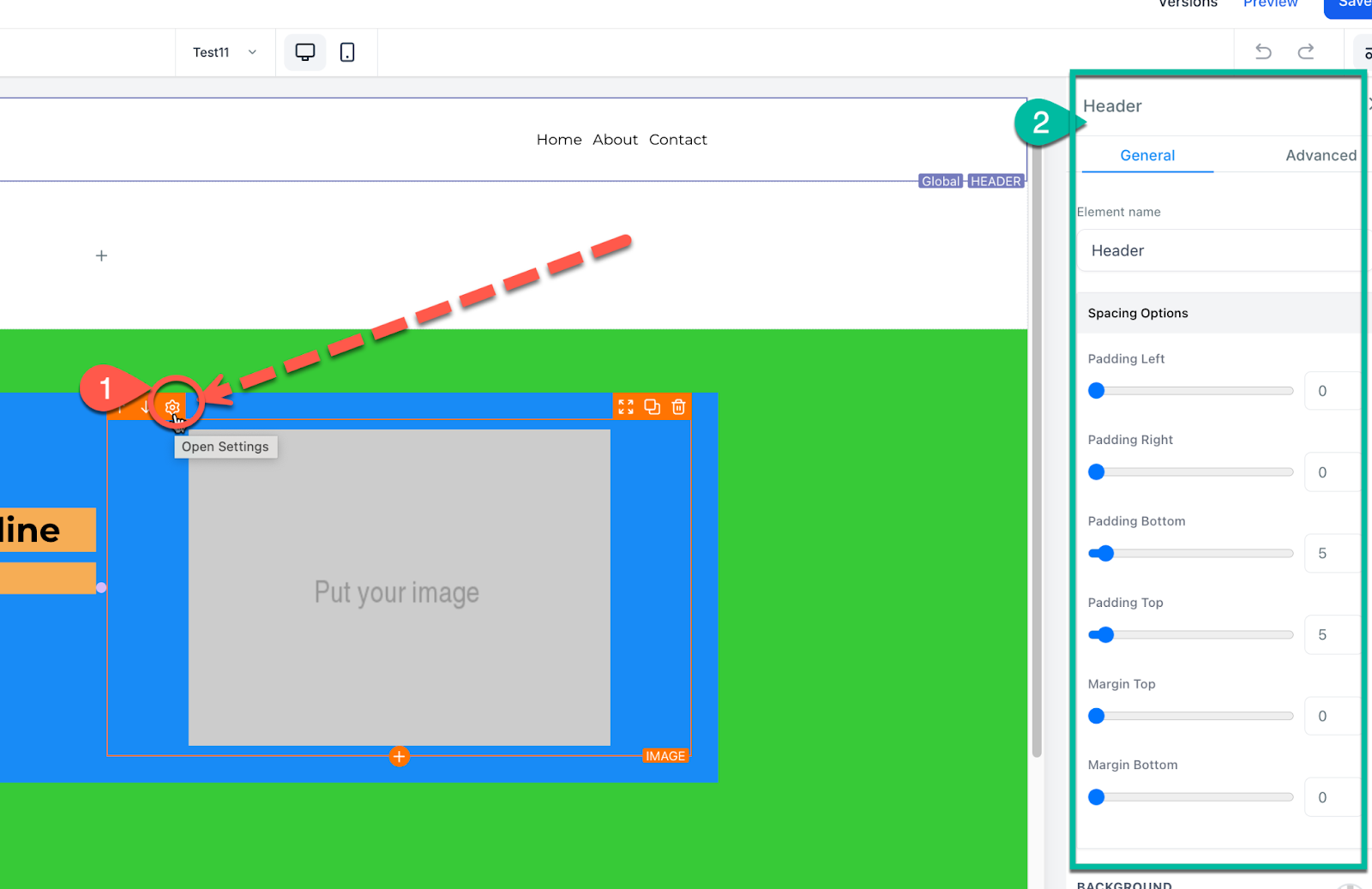To edit a specific section, row, column, or element, hover over the element then click on the gear setting icon that appears. In addition, clicking on any part of the element will also automatically open the pop-out settings menu on the right.
