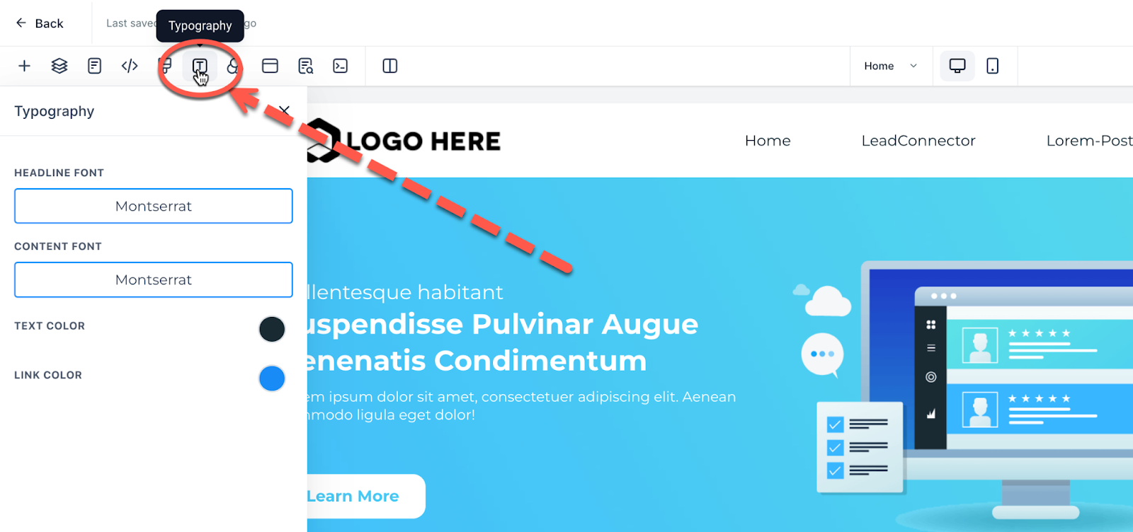 You can change the default font for your webpage headlines and content as well as your text and link colors within the typography.