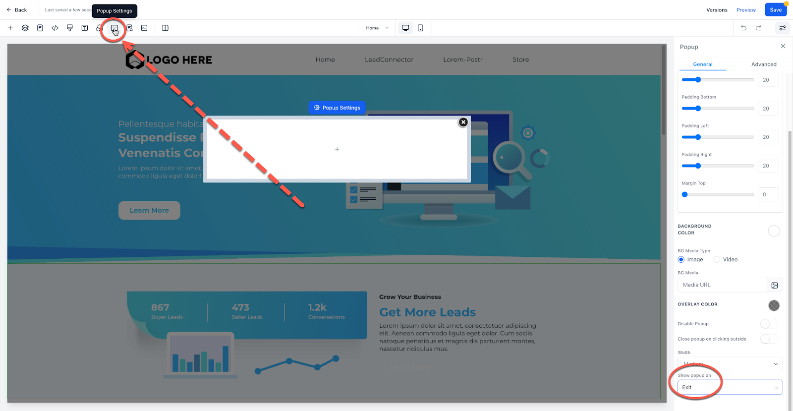 Most users dislike pop-ups, but the sad fact is that they still convert rather well, despite their bad rap. When you want to add a popup, you can do so from the Pop Up. After selecting it, you will use the pop-out setting menu on the right to edit the properties.