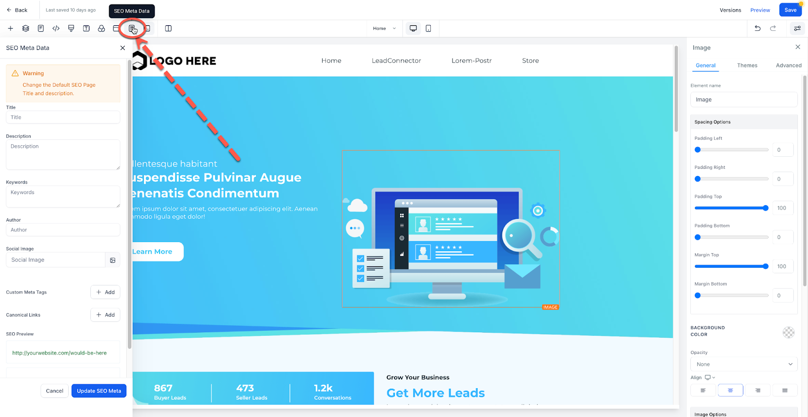 Here, you can edit the SEO metadata, this will show up in search engine results when searched. In addition, it will show in the tab settings of your browser, when you share your site link and more. It might seem small but having your SEO settings set up is important - it helps search engines find your site and when sharing a link, it helps users trust the link.