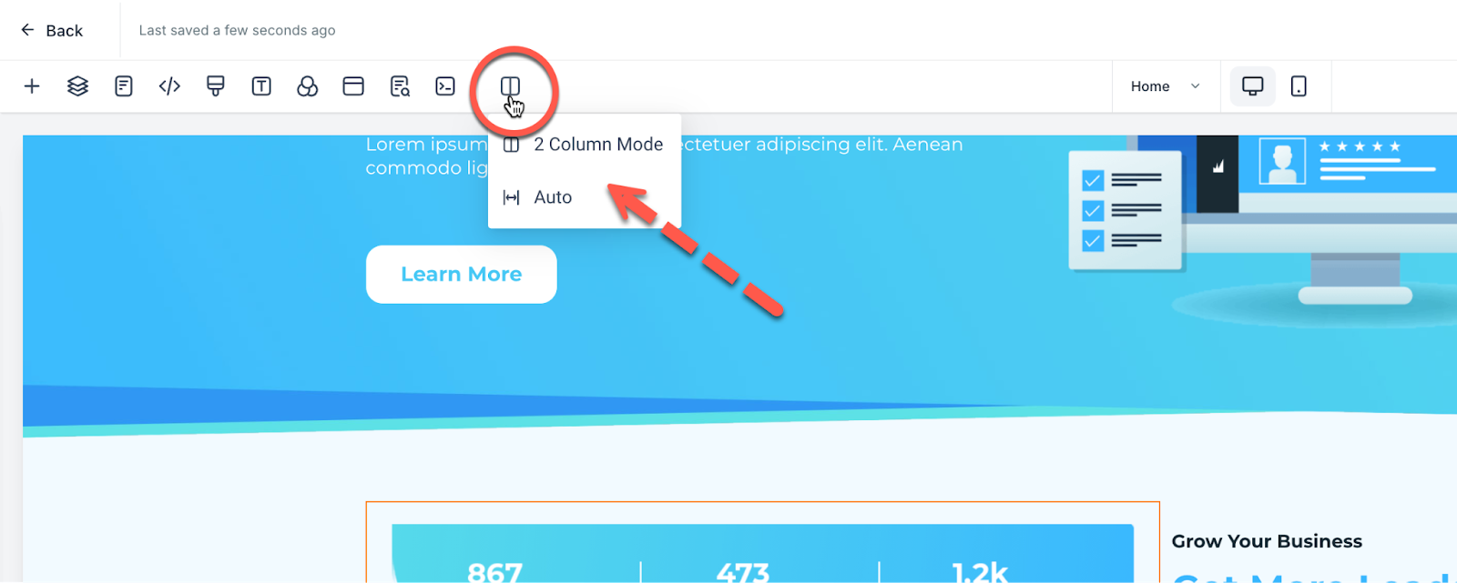 When you are using the builder you can choose to have the right popout lay over top of the webpage or you can set it to two-column mode, which will push the webpage into two columns. The first column is the webpage, the 2nd is the settings tag that popout on the right.