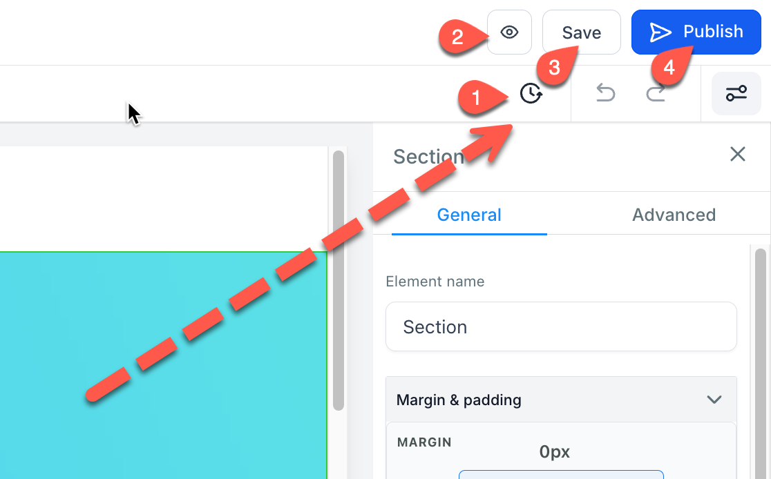 In the top right-hand side of your site builder, you will locate versions, preview, and save buttons. Let’s go through each of them below.