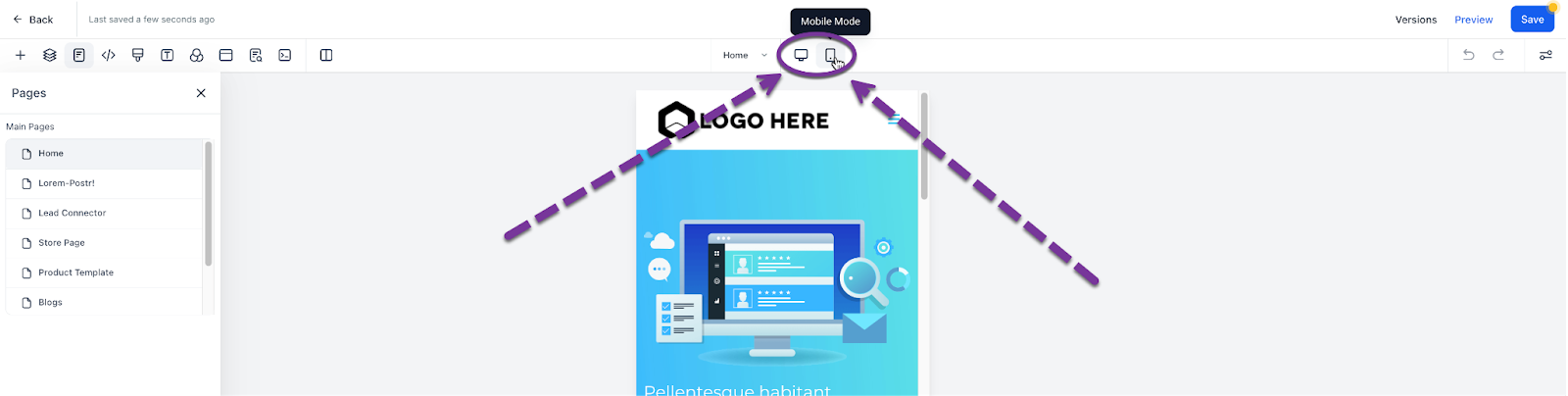 At the top of your editor, you will see a button for Desktop Mode and another called Mobile Mode. Selecting the “Mobile Mode” will toggle to the mobile view editor of your site.