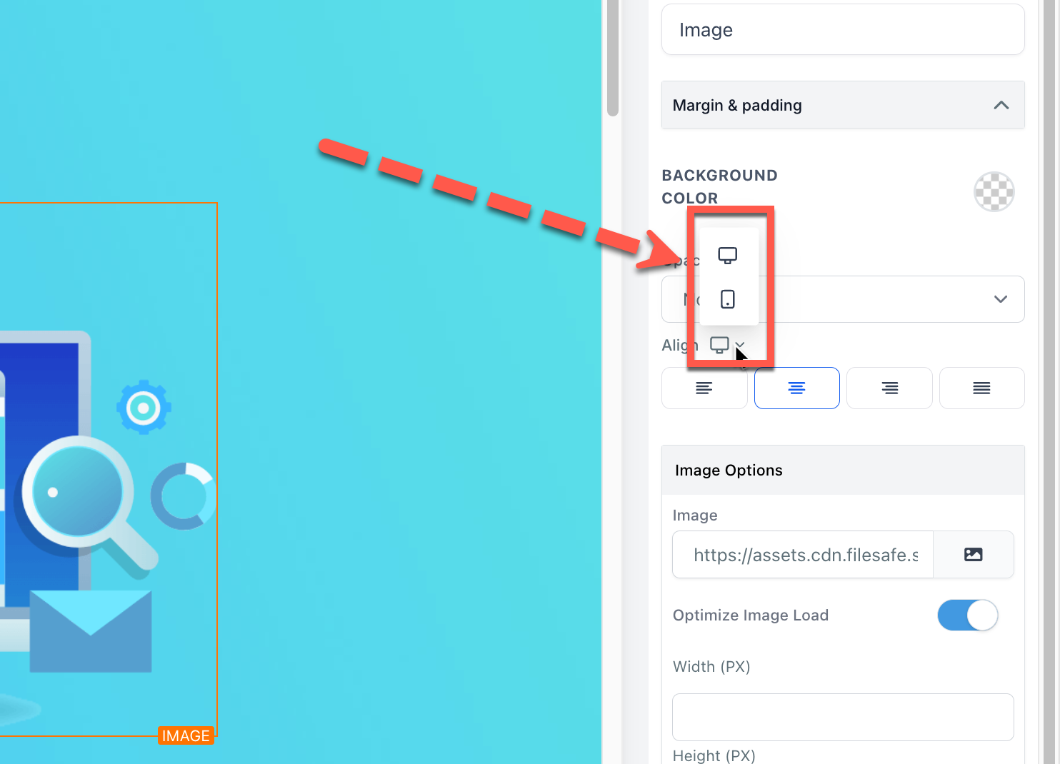 Within your object settings, you will see mobile responsive toggles that allow you to edit an object's settings unique to mobile or desktop. For example, the image below shows an image element alignment settings. This means you can change how this element looks on the desktop view, then toggle to the mobile view and edit the mobile settings to be unique from the desktop view.
