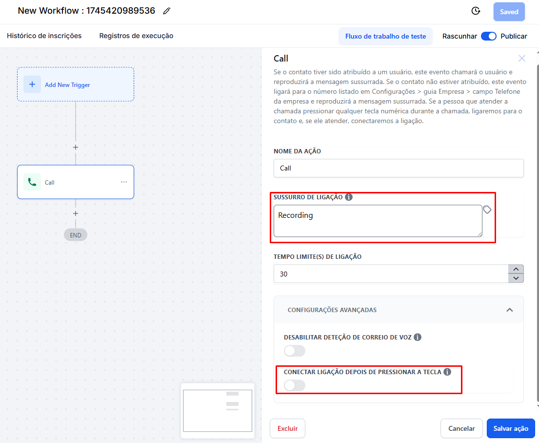 Start the default call action. The AI will listen to the whispered message 3 times, then call the contact.