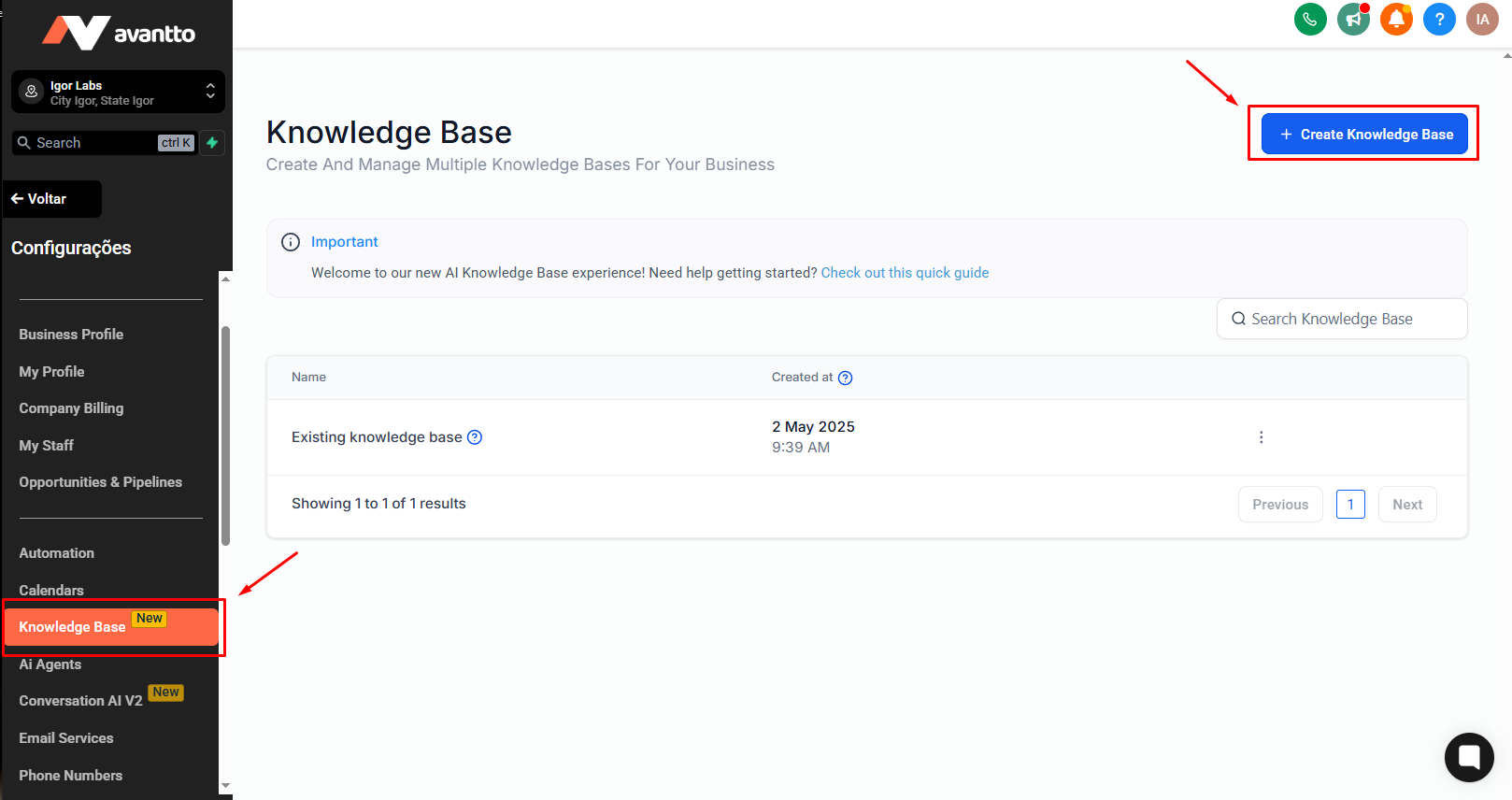 A new “Knowledge Base” menu item has been added to the left navigation panel.
