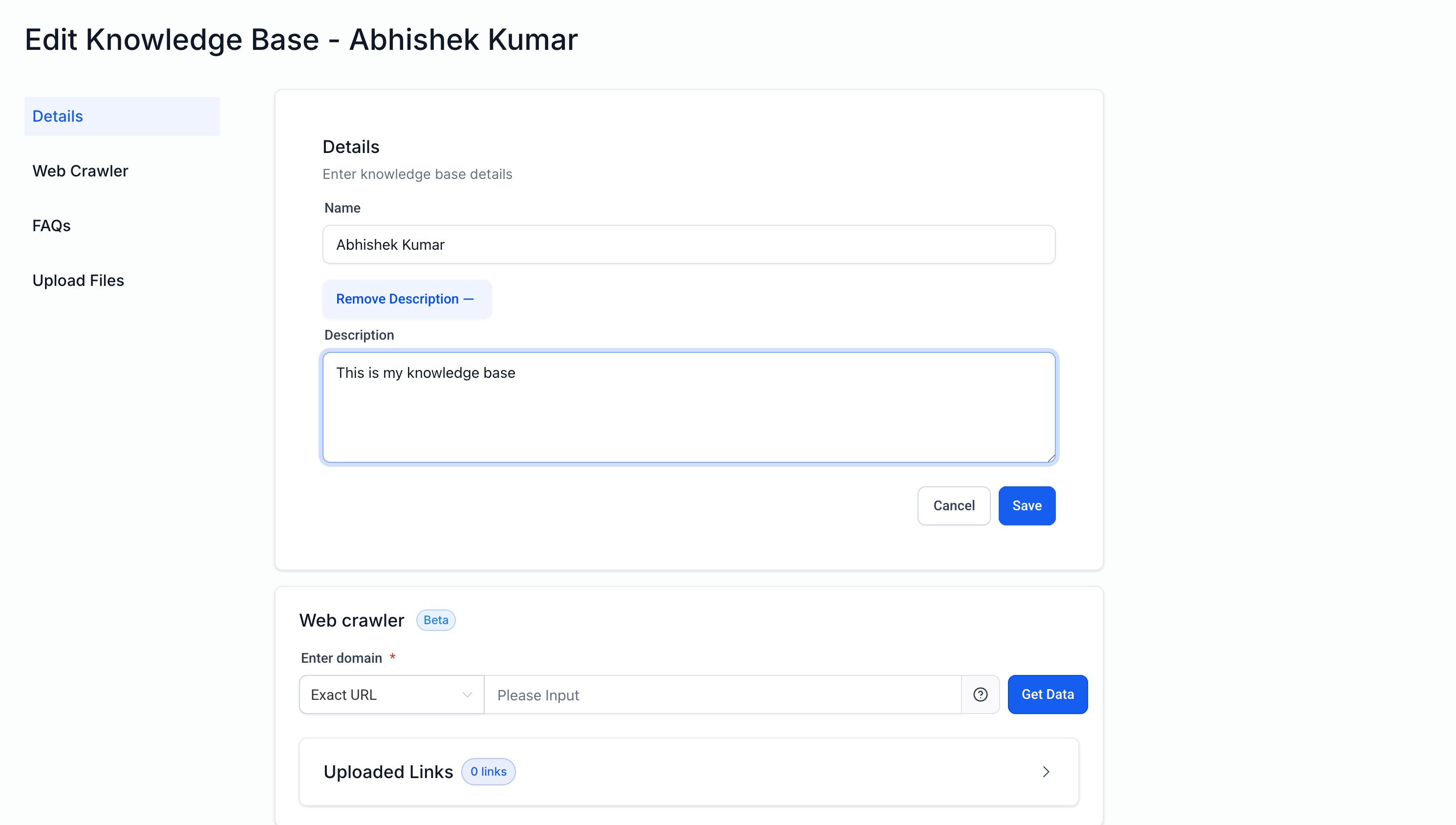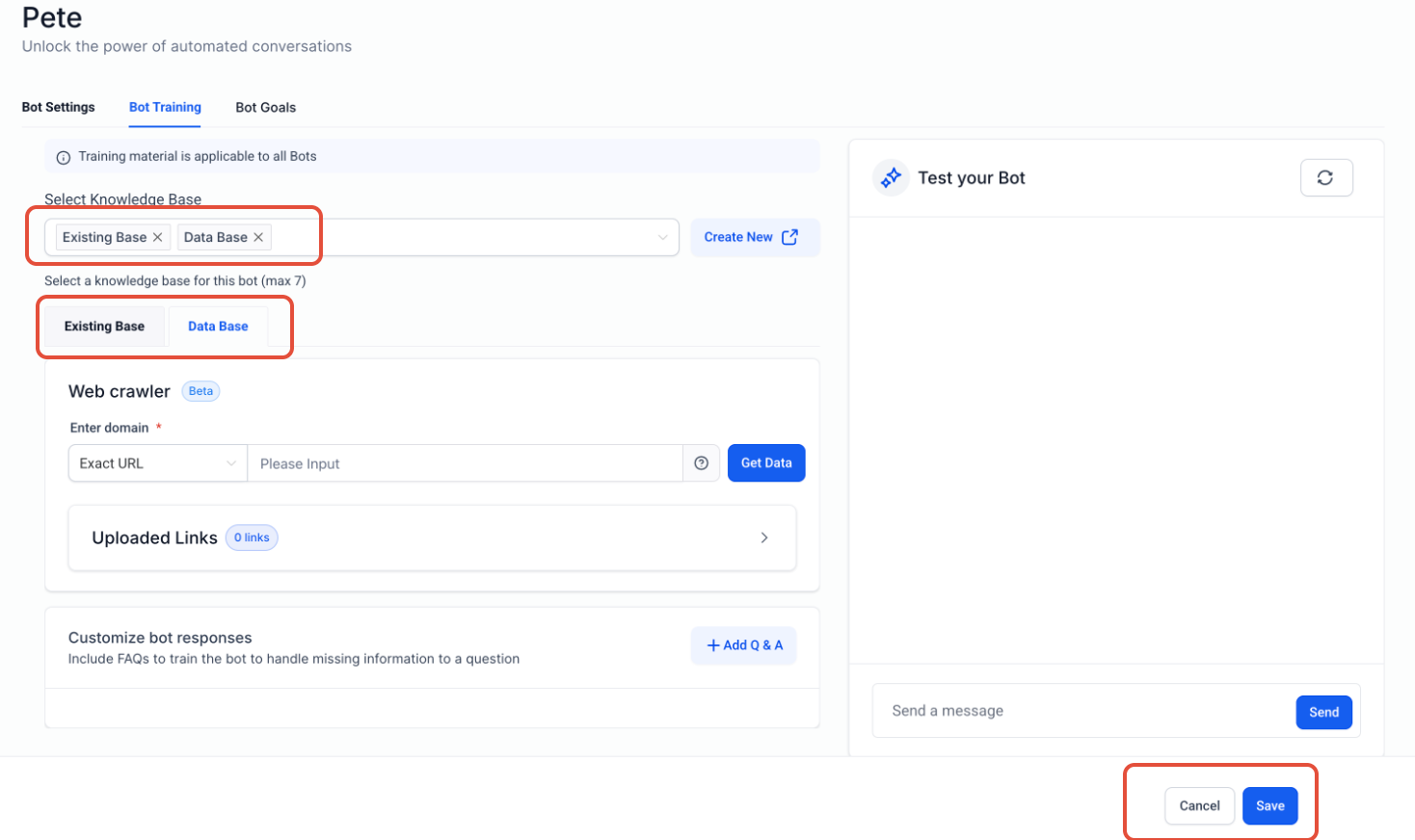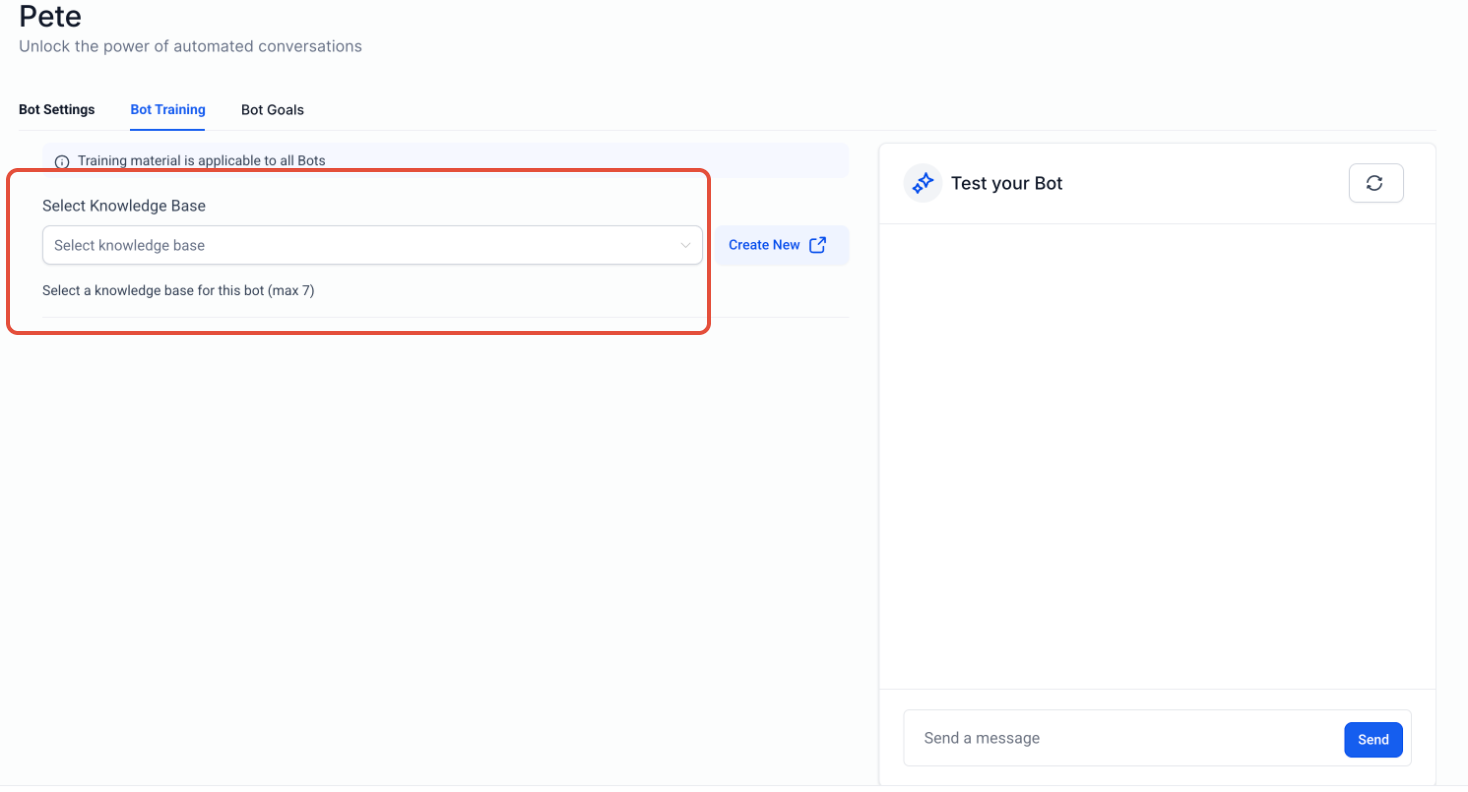 Use the Knowledge Base dropdown to select up to 7 knowledge bases to train the bot.