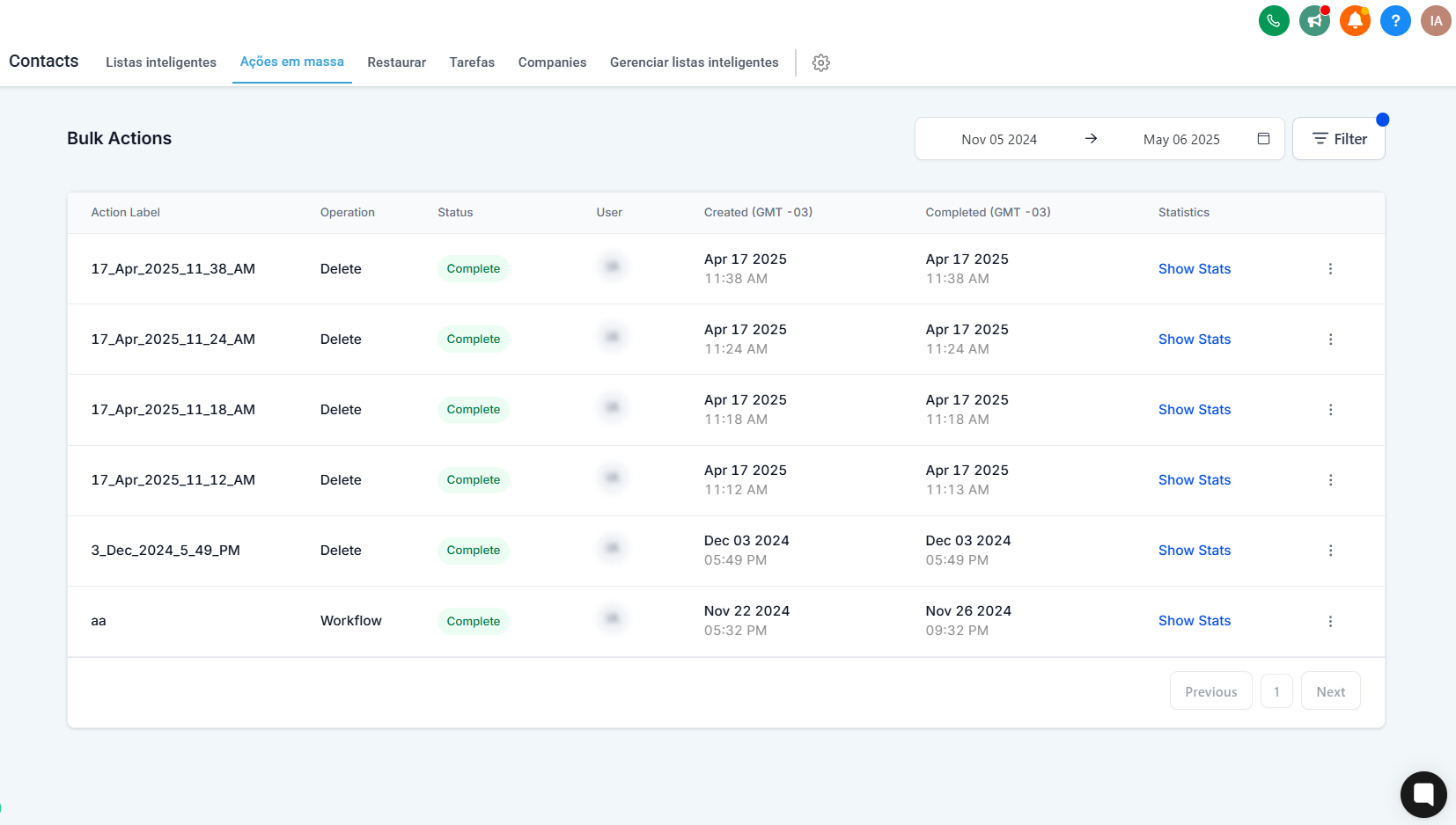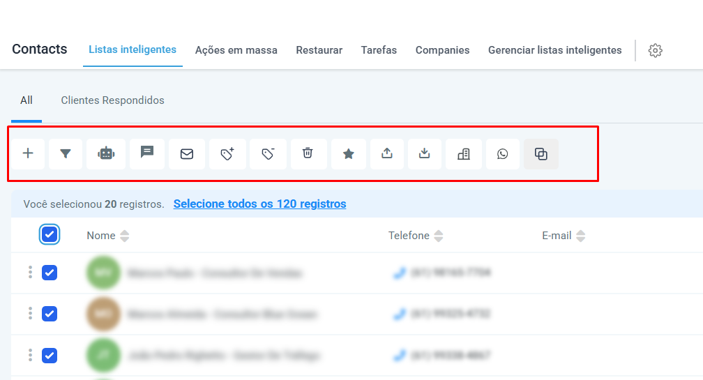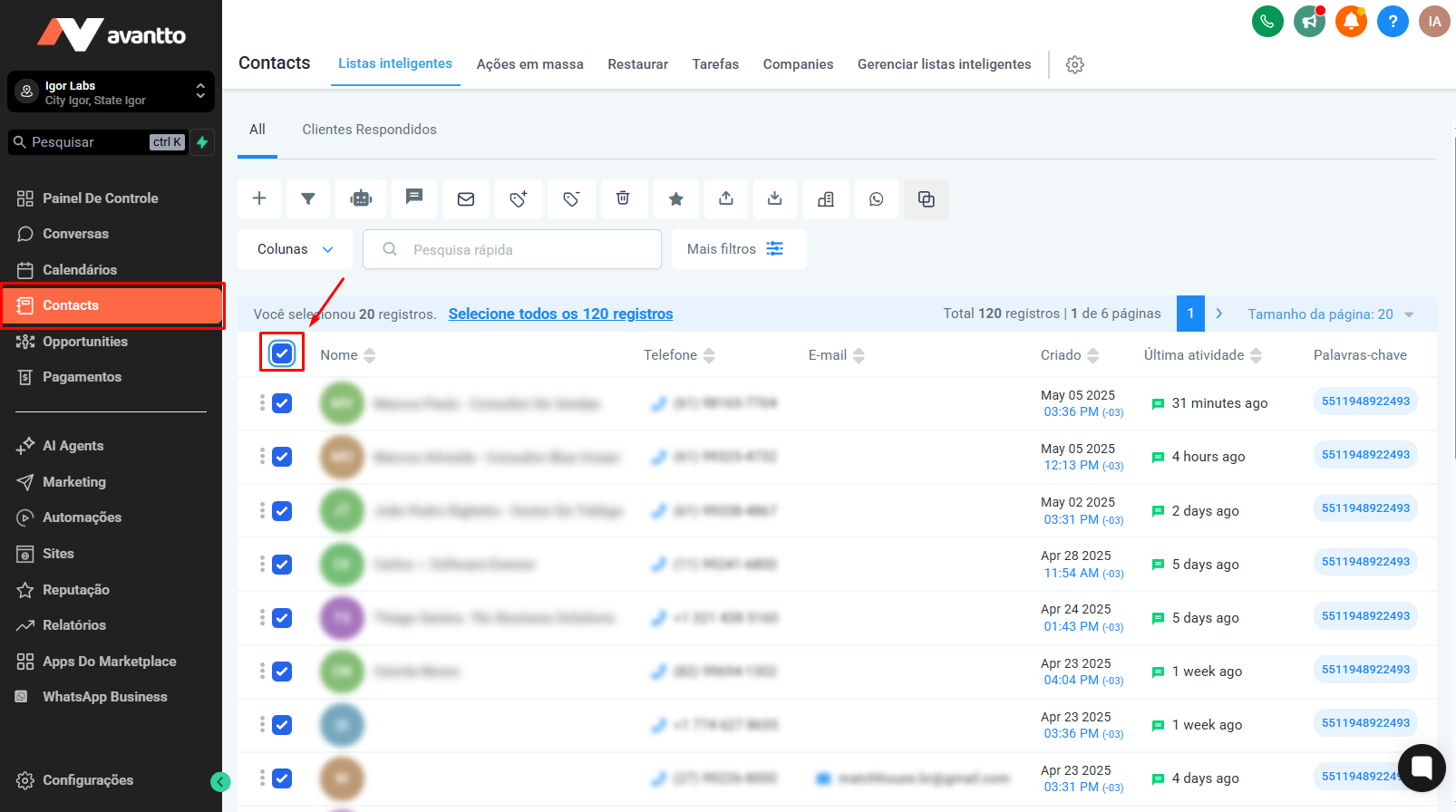 - Select current page: Click the checkbox at the top to select all contacts visible on the page.
