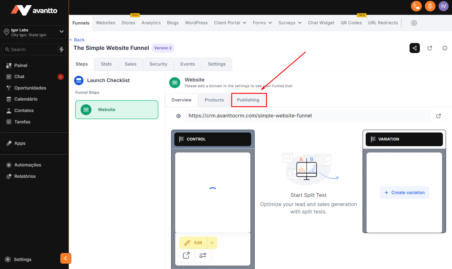 4.1 Para alterar o Snippets da página, clique em "Publishing".