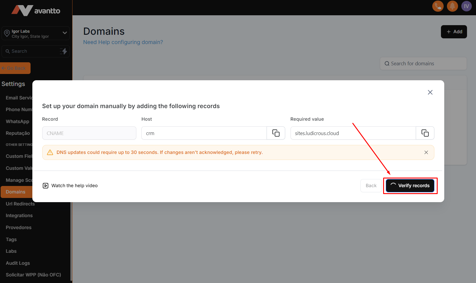 2.3 Após apontar o DNS corretamente, clique para verificar a conexão.