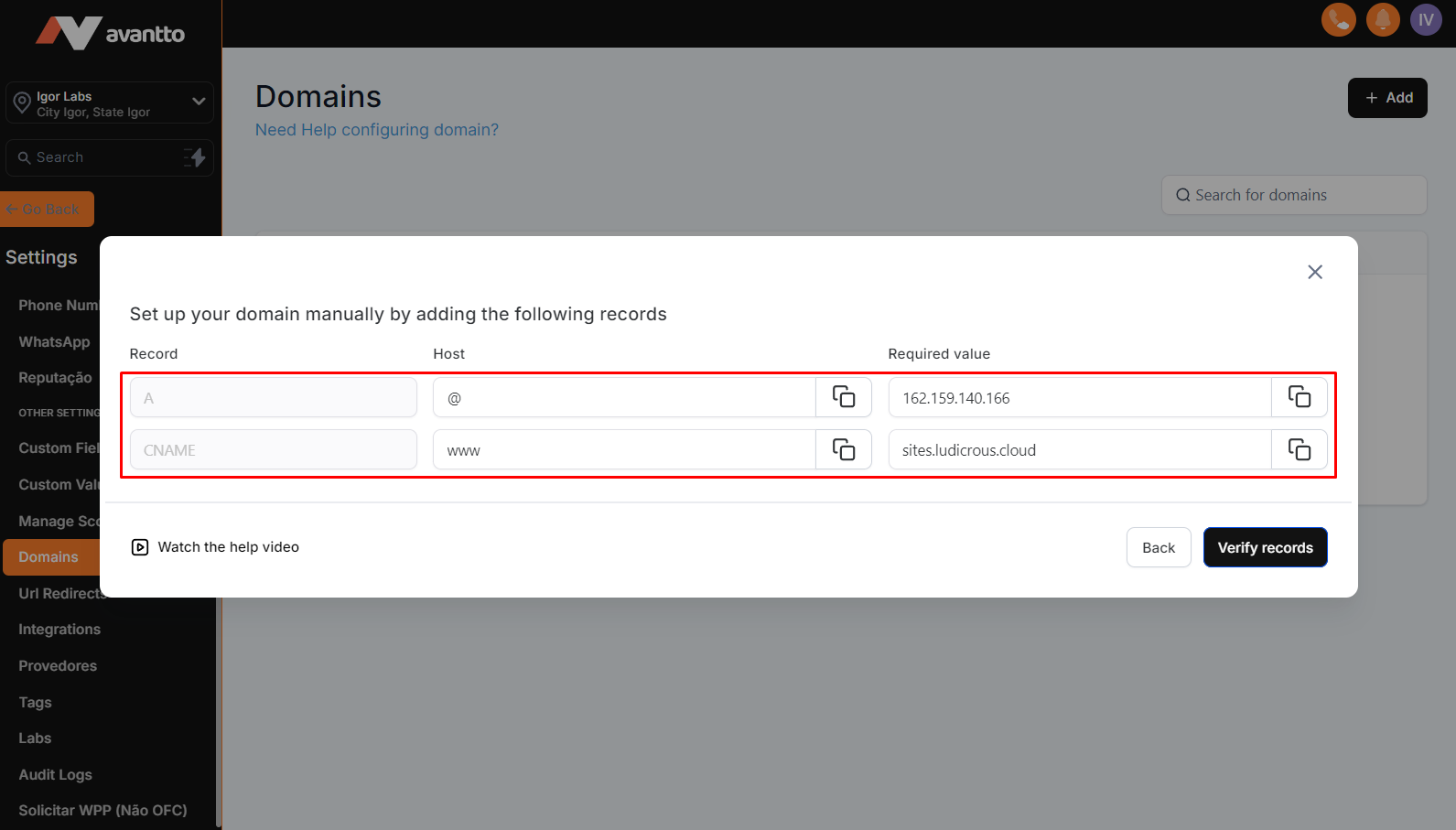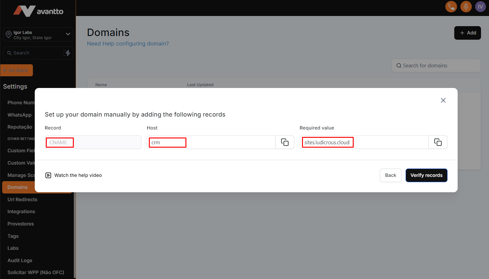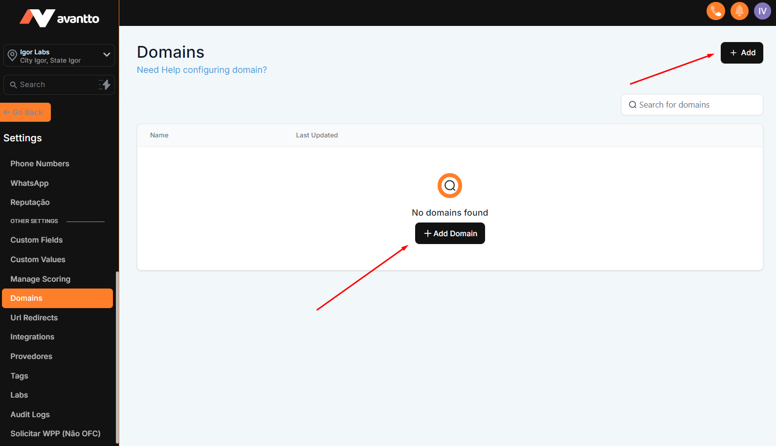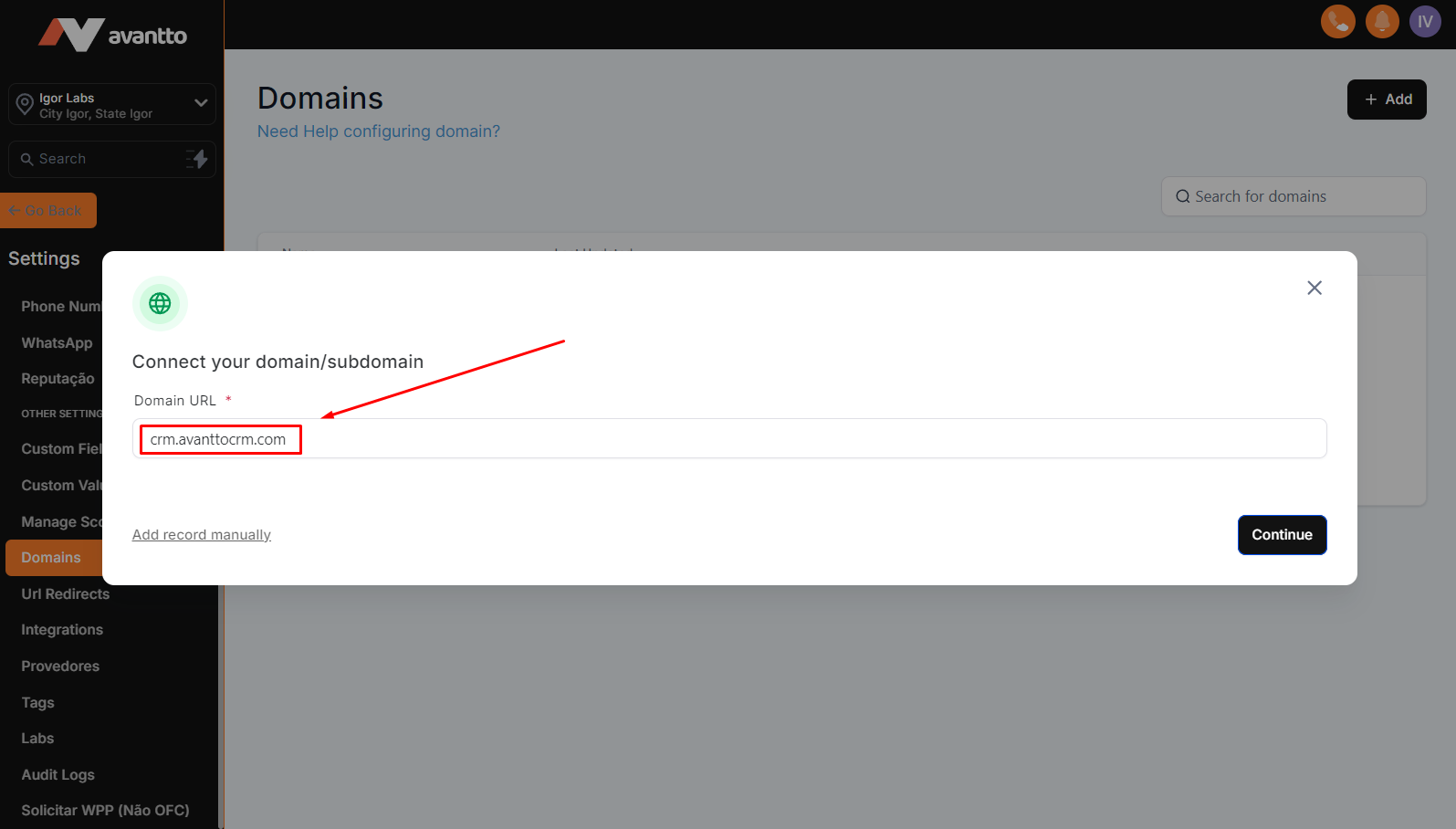 2.1 Nesse campo você irá colocar o domínio ou subdomínio que irá adicionar á Avantto, tendo a opção de adicionar manualmente e apontar o DNS por conta própria, ou no caso de domínios da GoDadday, clicar em continuar e adicionar de forma automática apenas seguindo os passos.