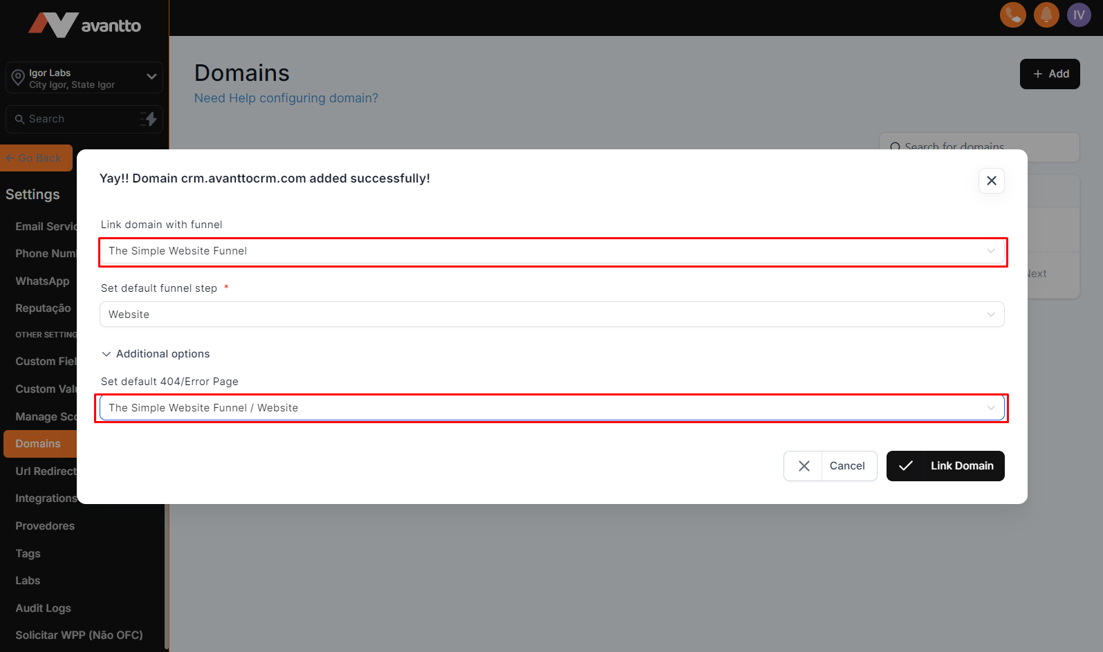 2.4 Selecione a página padrão para o subdomínio ou domínio, e também a página padrão para os casos de erro de conexão e por último clique em "conectar domínio/Link Domain"