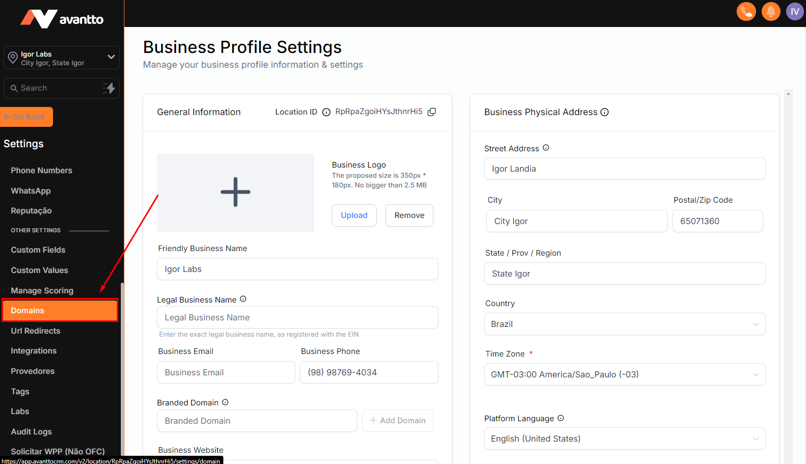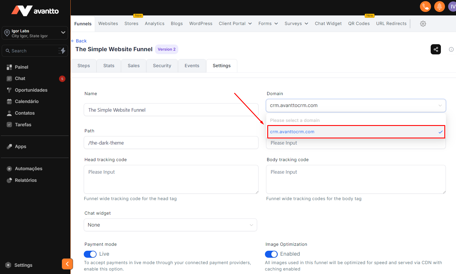 3.2 No campo de "Domínio/Domain" selecione o sub/domínio que você deseja utilizar e clique em "Save/Salvar" mais abaixo na página para aplicar a configuração.