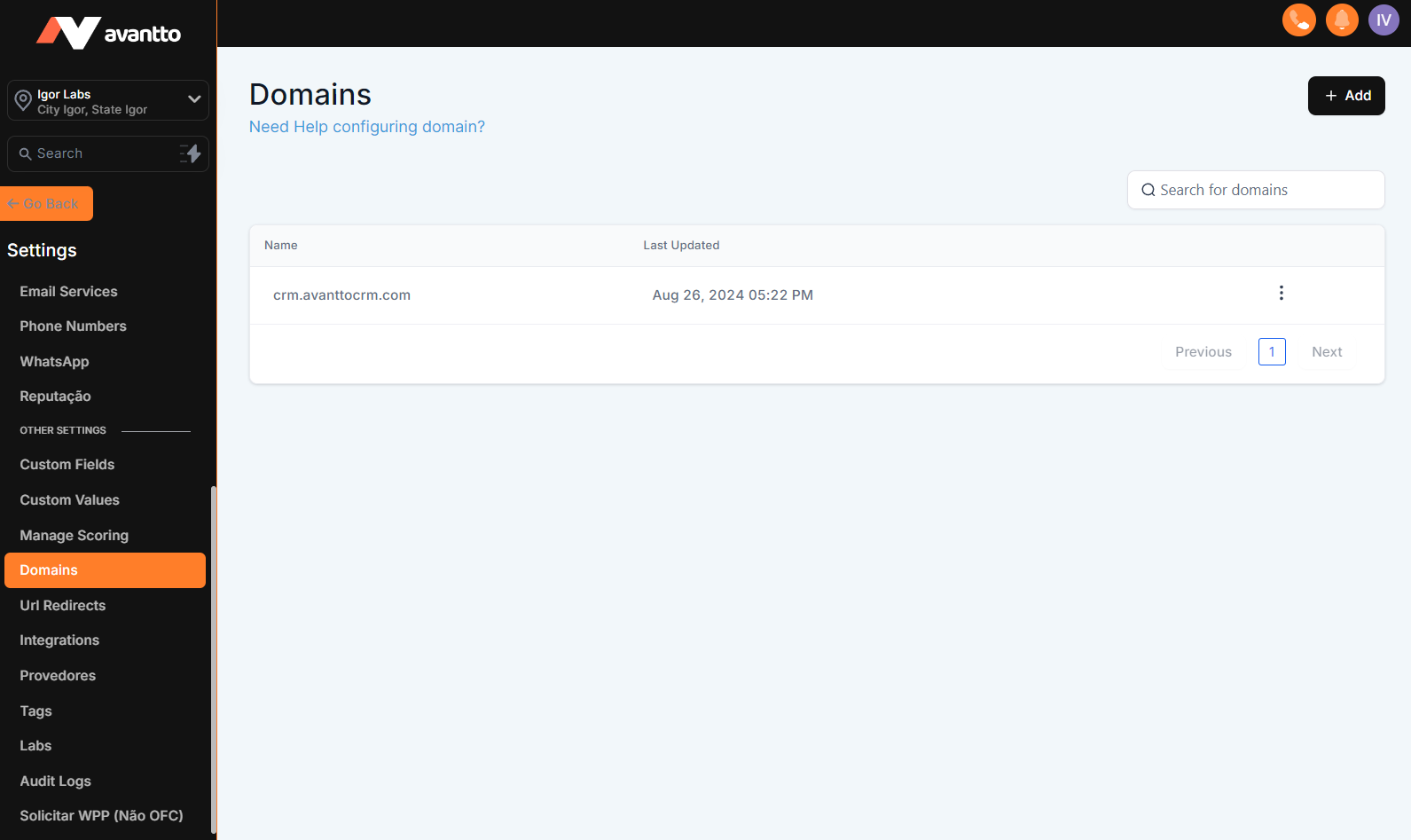 1.3 Clique em "adicionar/add" para adicionar novos domínios ou subdomínios.