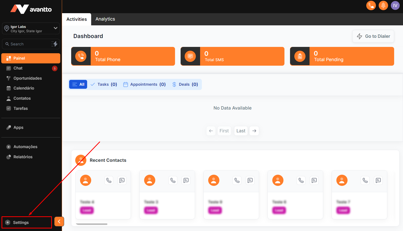 1.1 Clique em "Configurações" no menu do lado esquerdo.