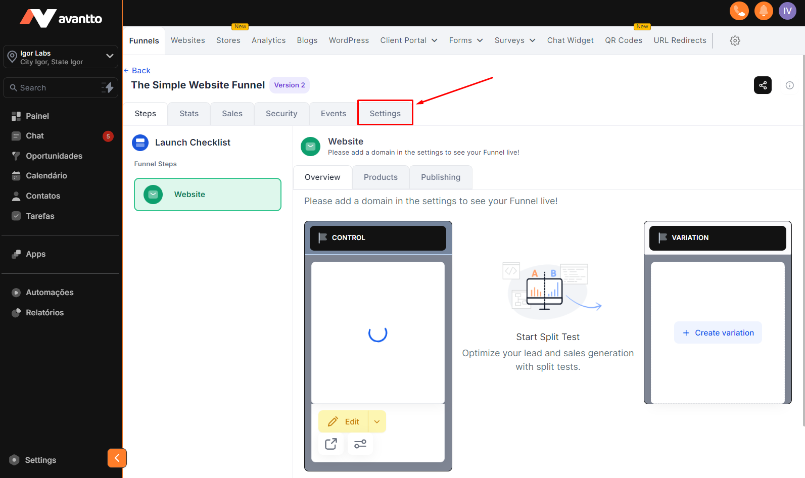 3.1 Dentro da página escolhida para utilizar o sub/domínio clique em "configurações/settings".