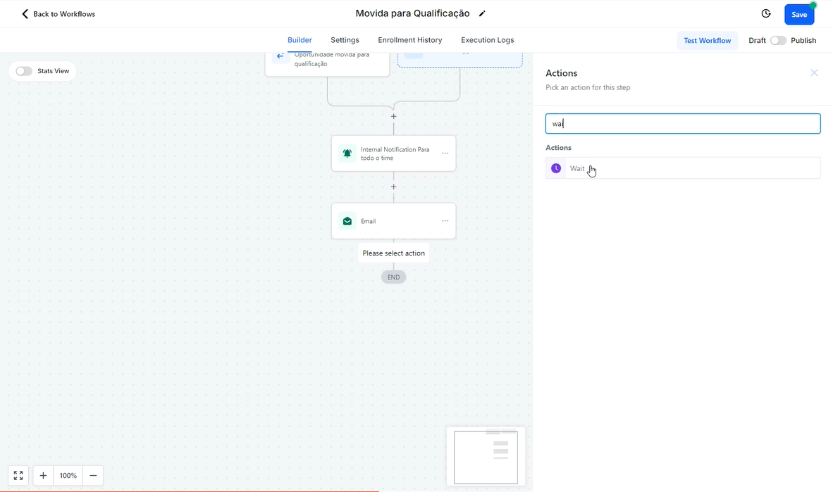 Na página de criação de fluxos, clique no "+" e escolha a ação "Wait / Espera".