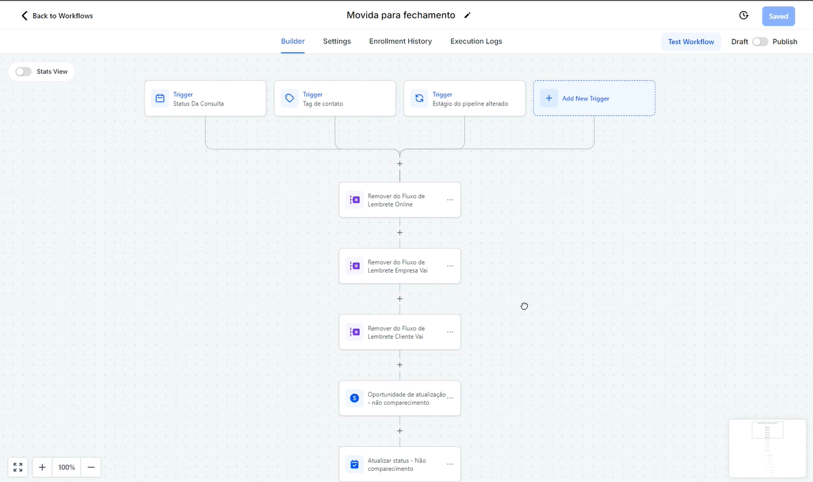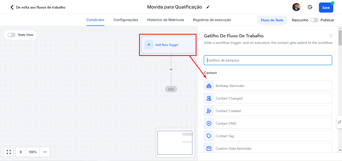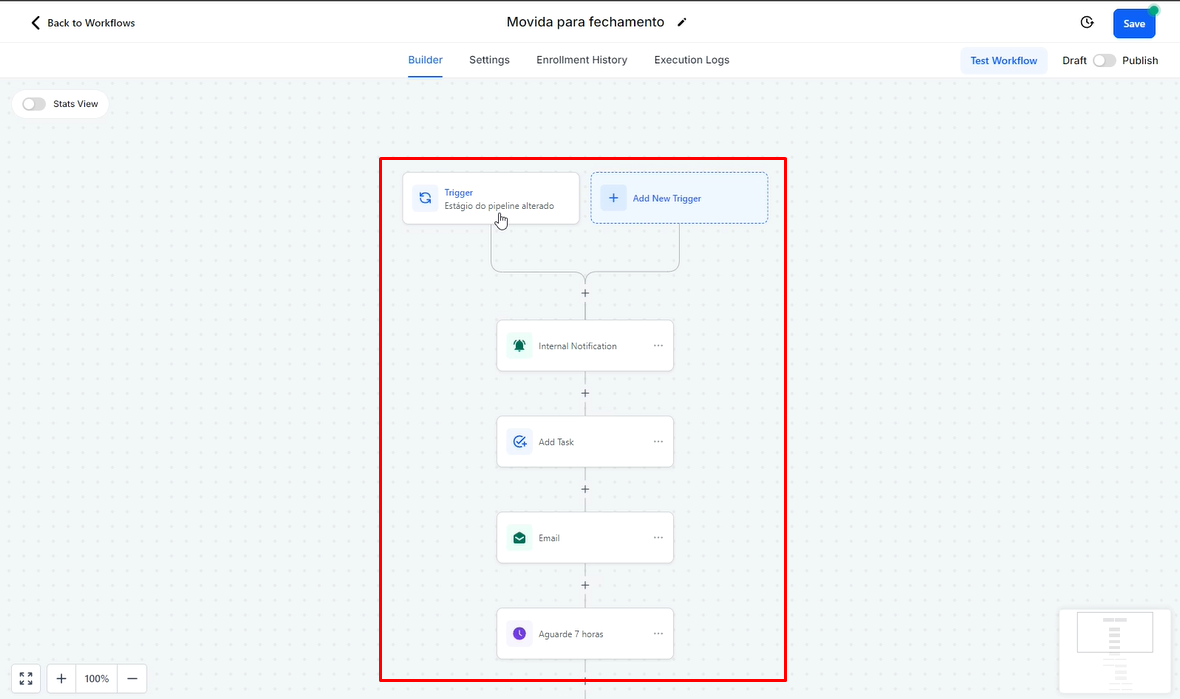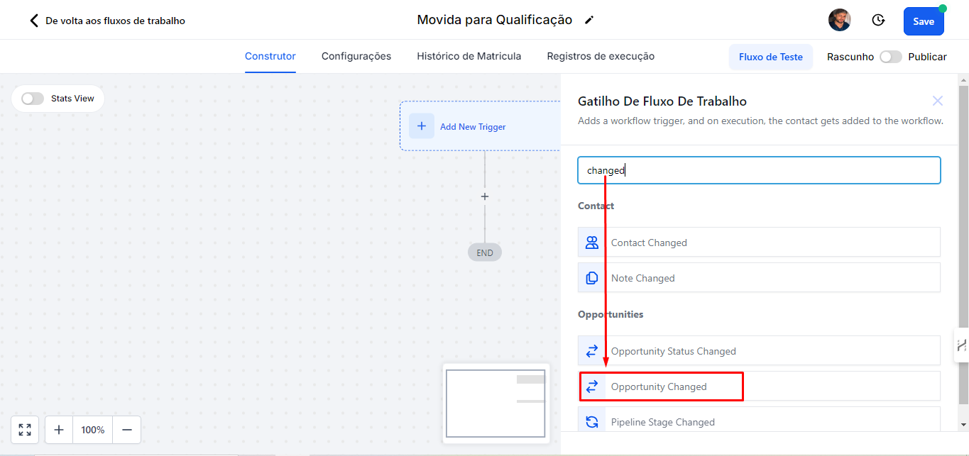 Além disso, existem outras opções de gatilhos disponíveis, como quando a oportunidade tem seu status alterado para "Perdido" ou "Ganho". Embora existam vários tipos de gatilhos, o foco aqui é demonstrar as movimentações entre as etapas do funil.