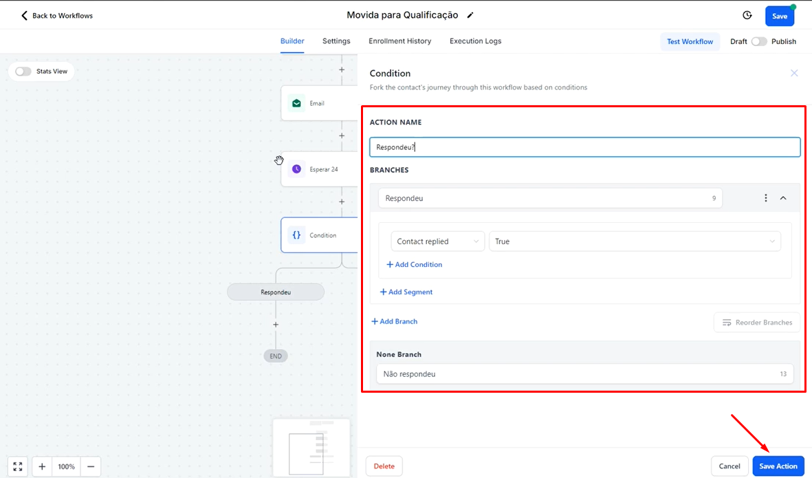 Nessa ação, você dará seguimento ao fluxo com base se o cliente respondeu ou não, separando em dois ramos: "Respondeu" e "Não Respondeu".