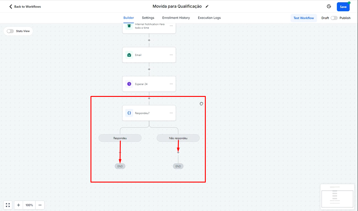 Após isso, cole essas ações no "+" abaixo da opção "Não Respondeu".