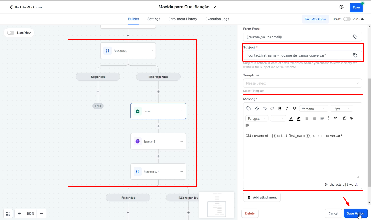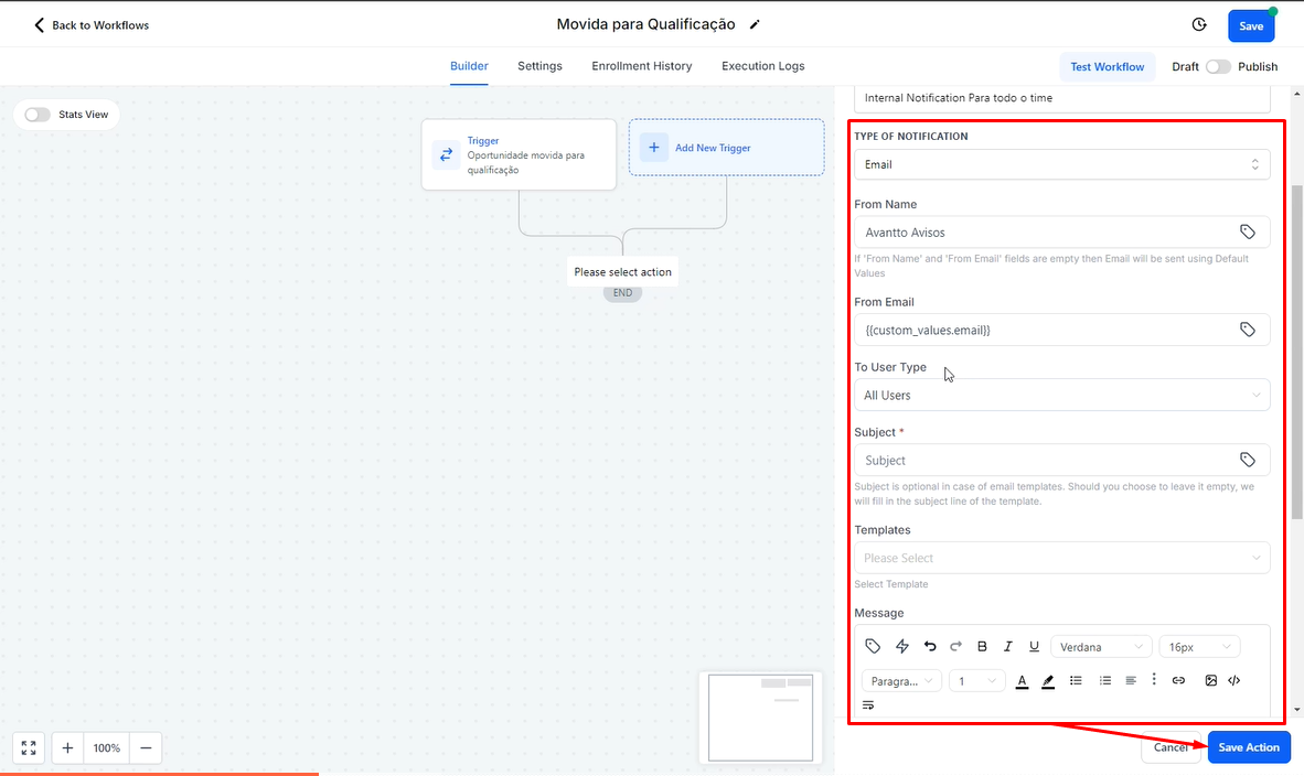 From Email: O e-mail enviado deve ser um endereço válido. Se o endereço não existir, a mensagem não será enviada. É recomendável utilizar um e-mail que pertença a algum usuário da conta. Portanto, sugere-se usar um e-mail cadastrado nos Custom Values, como {{custom_values.email}}.