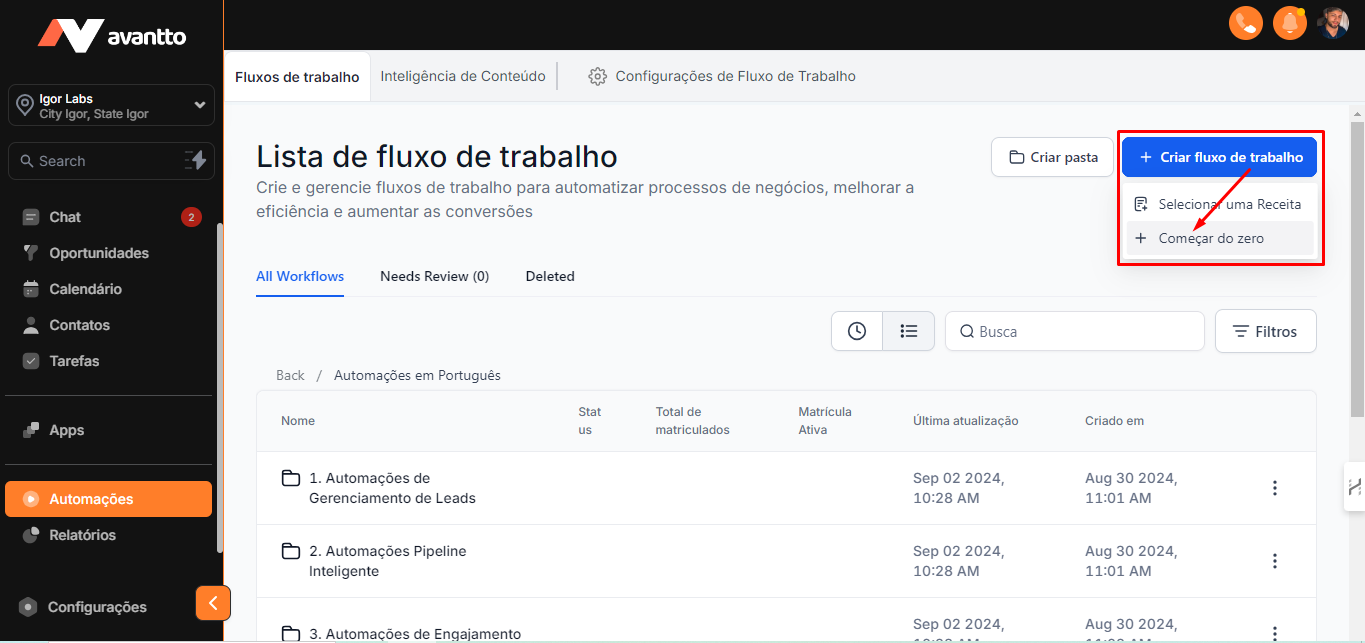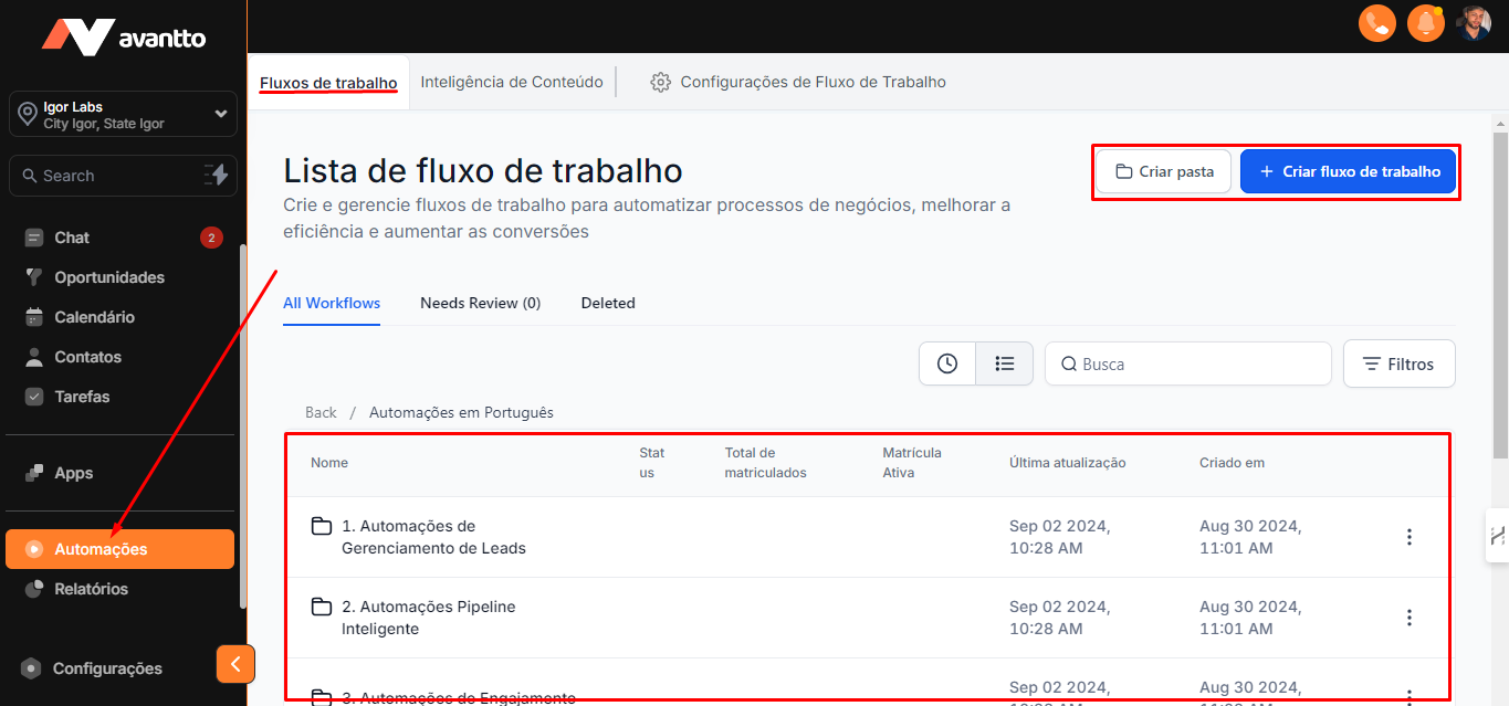1.1 No menu lateral esquerdo, clique em "Automações". Nesta seção, você encontrará os fluxos e pastas já existentes.